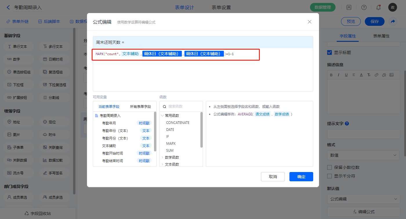 【周末还班天数】字段,默认值选择公式编辑,如图设置公式;