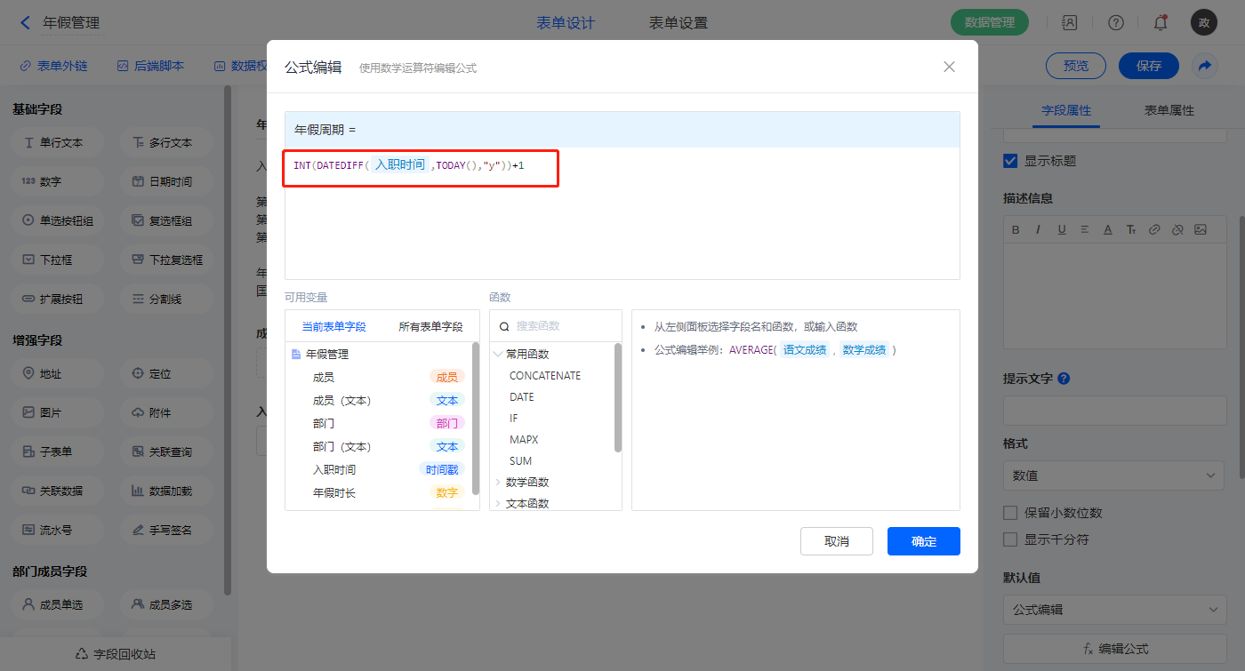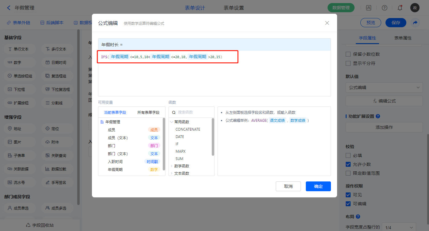 【年假时长】字段,默认值选择公式编辑,如图设置公式;