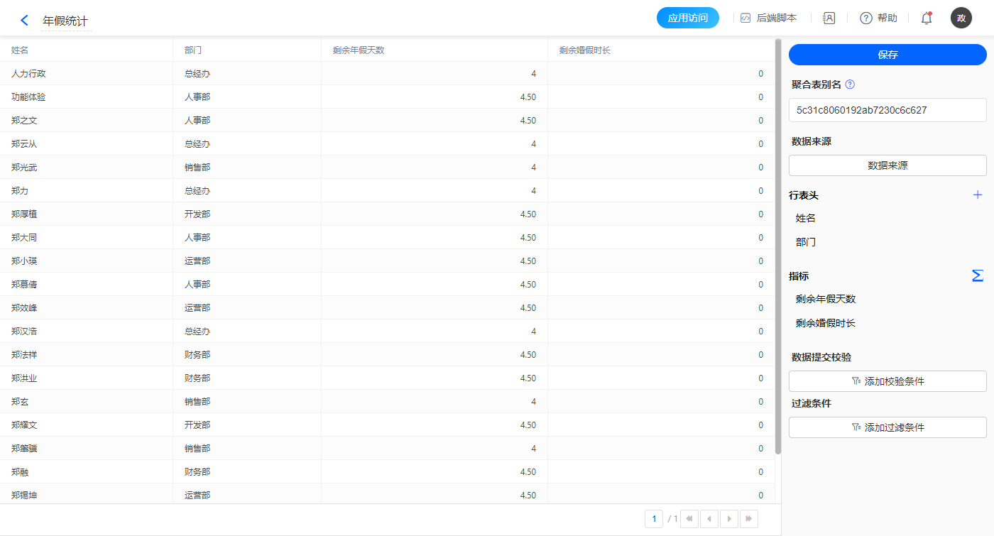 1、该应用运用到1个聚合表【年假统计】;