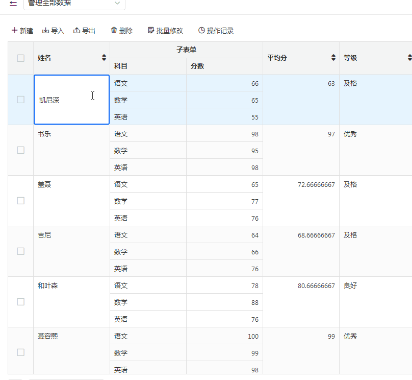 • 表格快捷编辑,不支持新增子表单行。