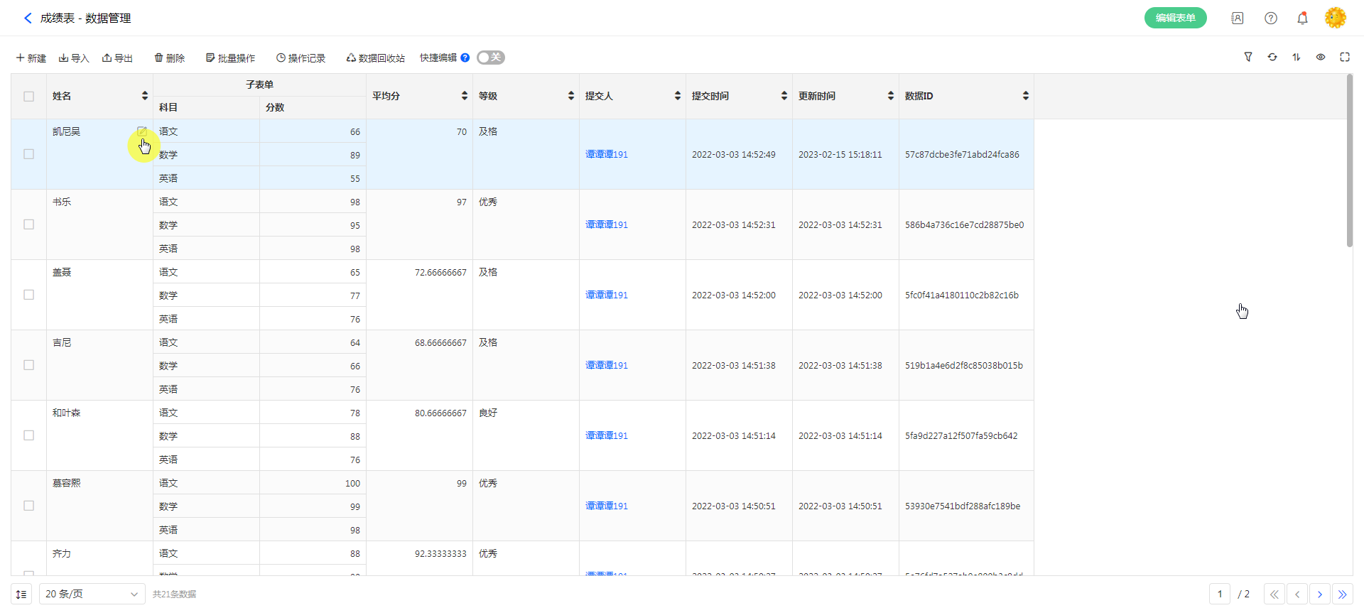 当用户单条数据修改内容较少,但需要频繁修改多条数据时,可以在表格上快捷编辑数据。