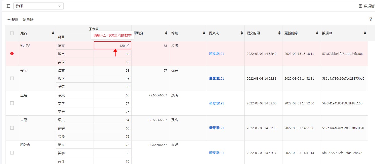 • 权限组表格上快捷编辑数据时触发表单提交校验、必填校验、数值范围校验、聚合表校验;触发公式、数据联动、扩展体系等。