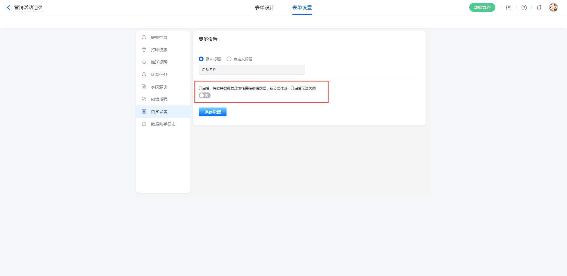 • 旧的表单需要在 表单设置-更多设置 开启管理编辑功能,开关打开后不再显示