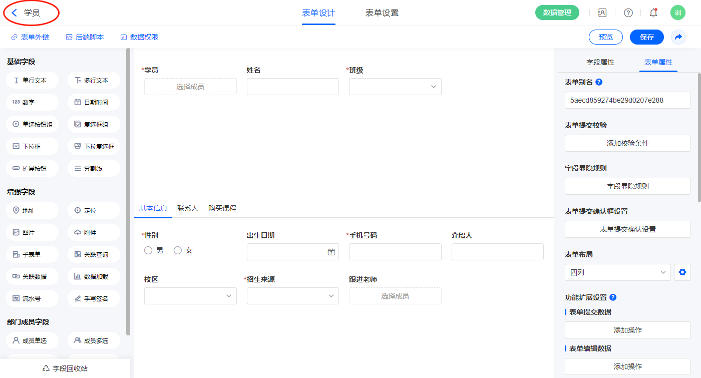 2.3、表单【学员】字段及表单属性设置