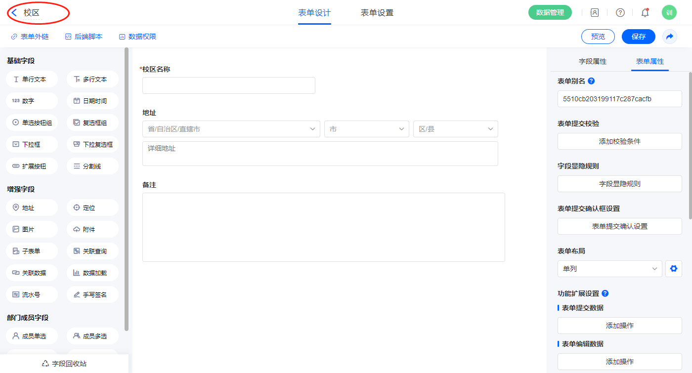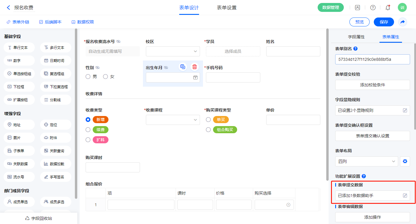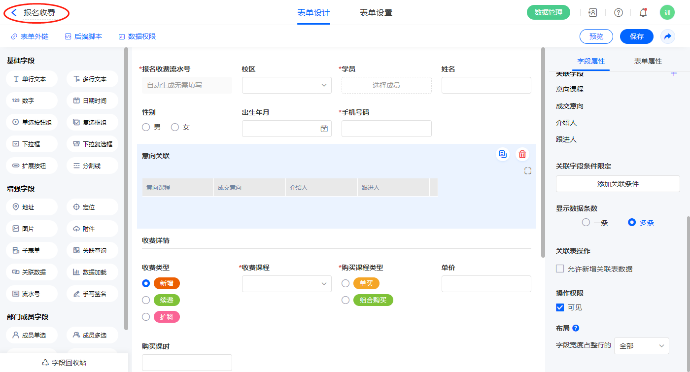 2.5、表单【报名收费】字段及表单属性设置
