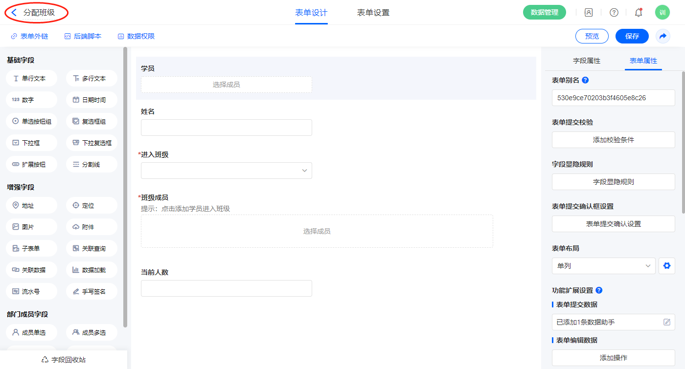 2.2、表单【分配班级】字段及表单属性设置