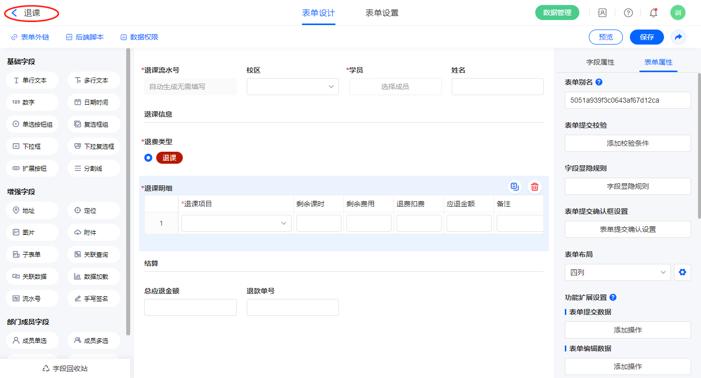 2.6、表单【退课】字段及表单属性设置
