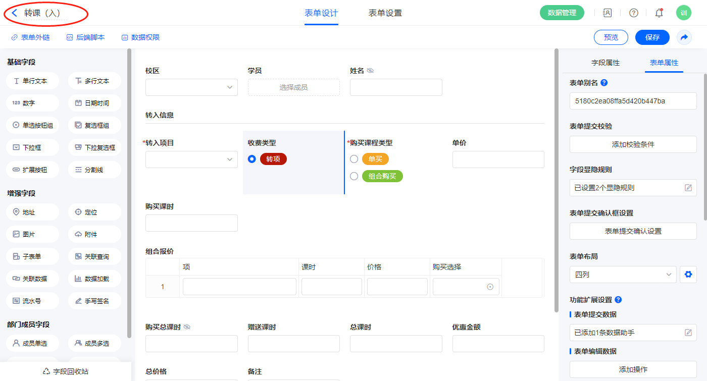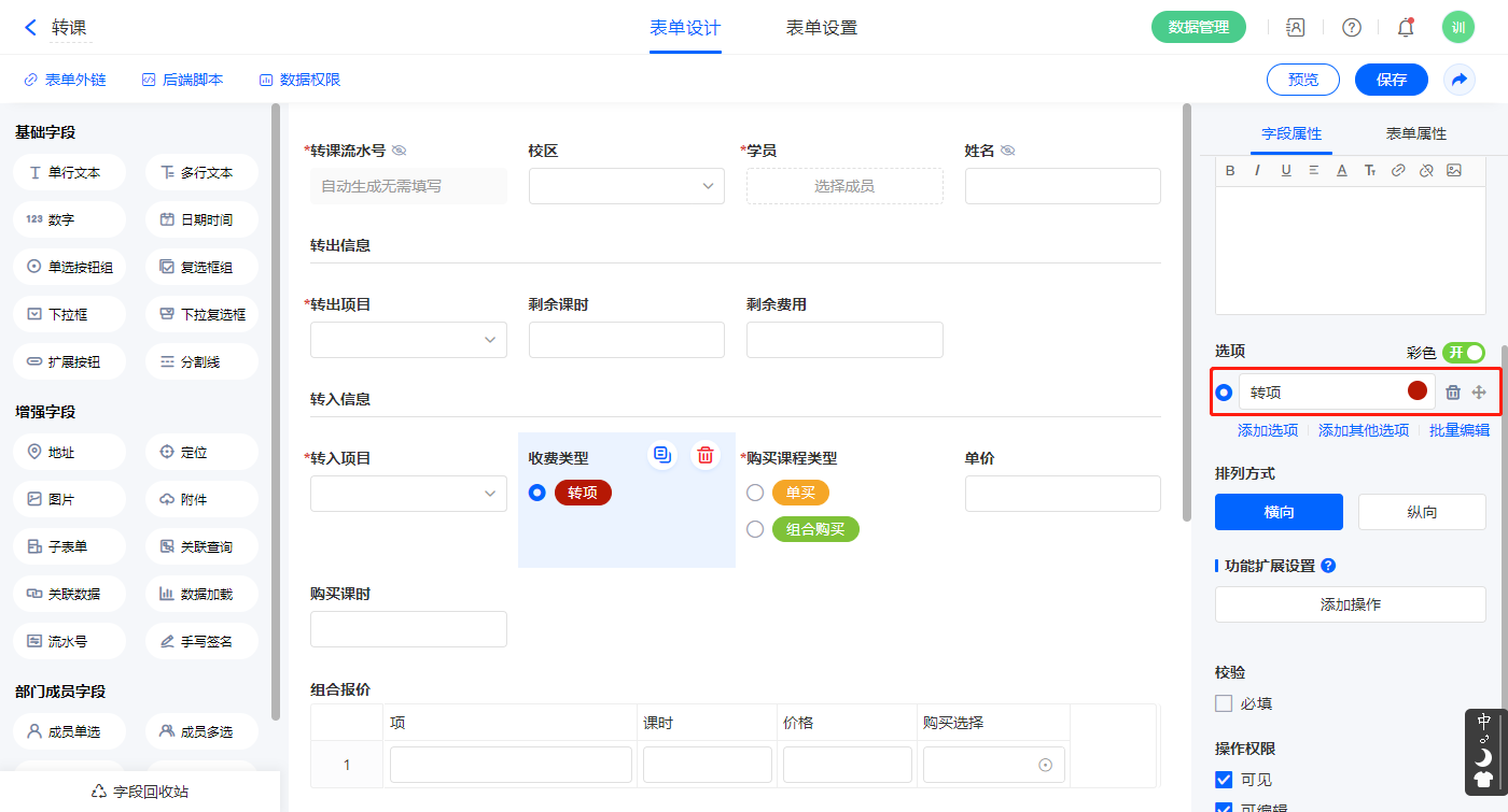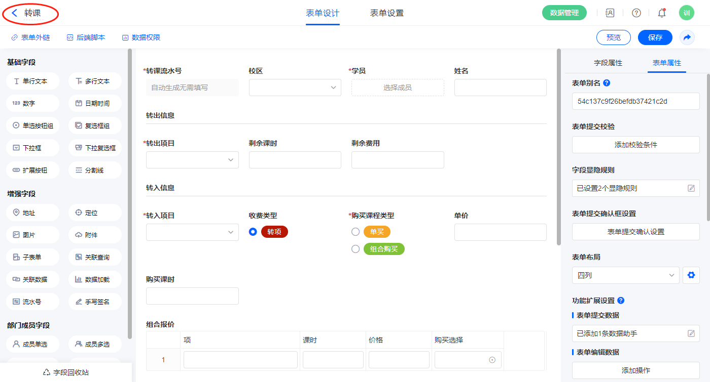 2.7、表单【转课】字段及表单属性设置