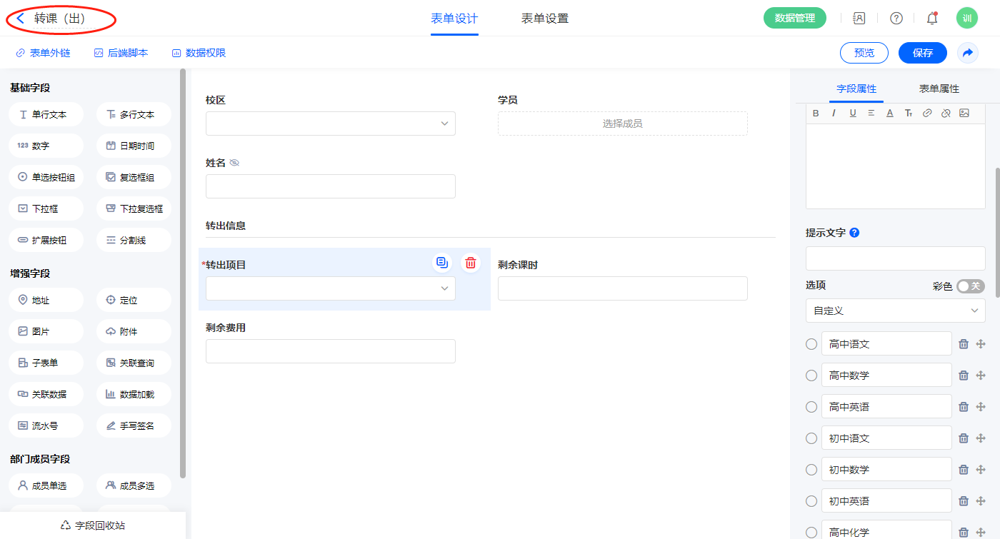 9)新增表单【转课】,字段设置如下;