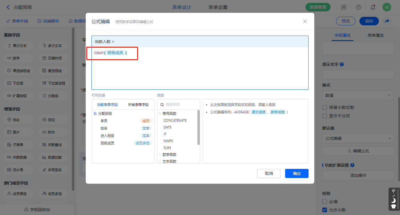 1)【当前人数】字段,默认值选择公式编辑,如图设置公式;
