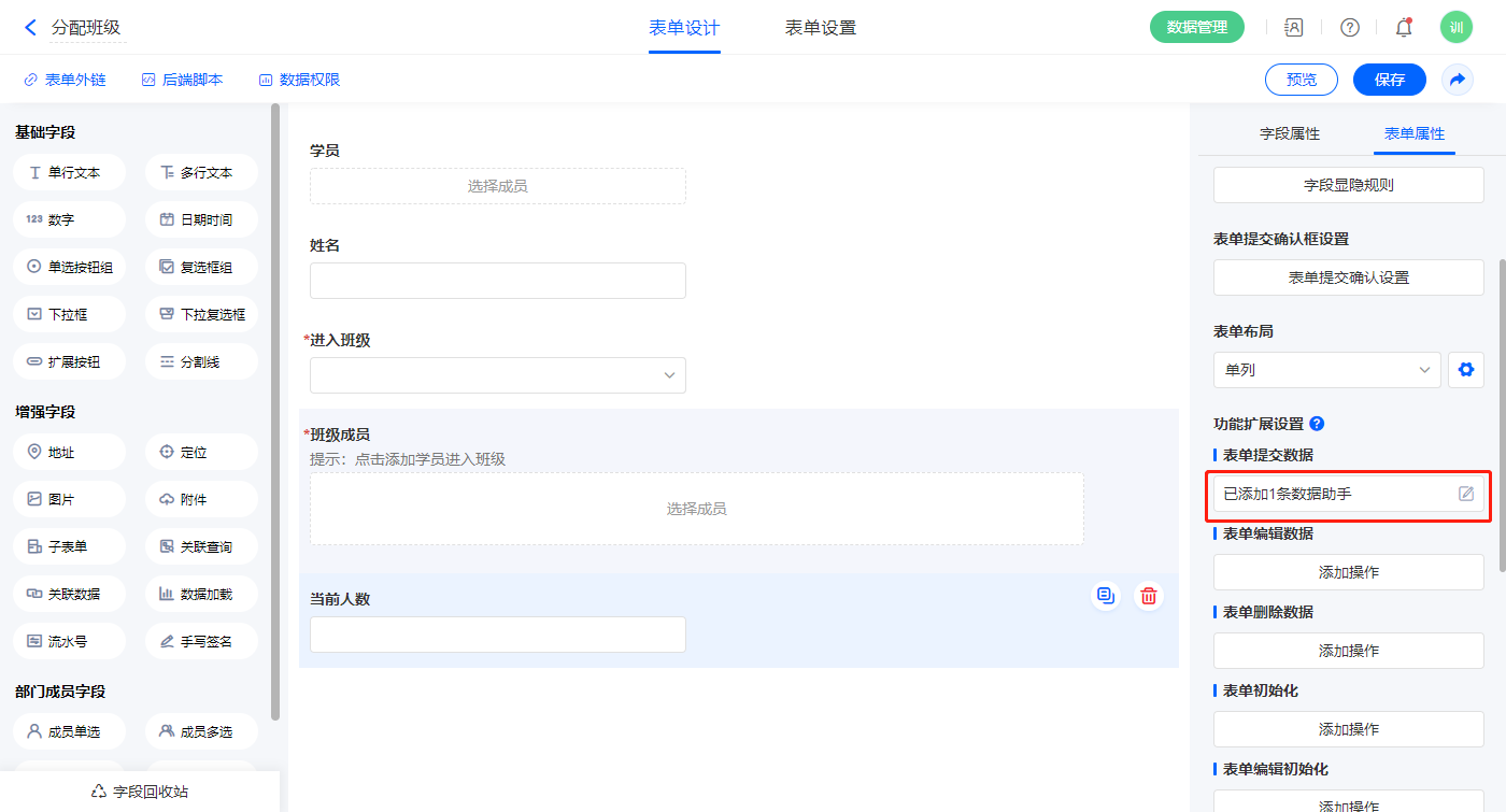 2)表单提交设置1条数据助手,名称为修改班级人数;