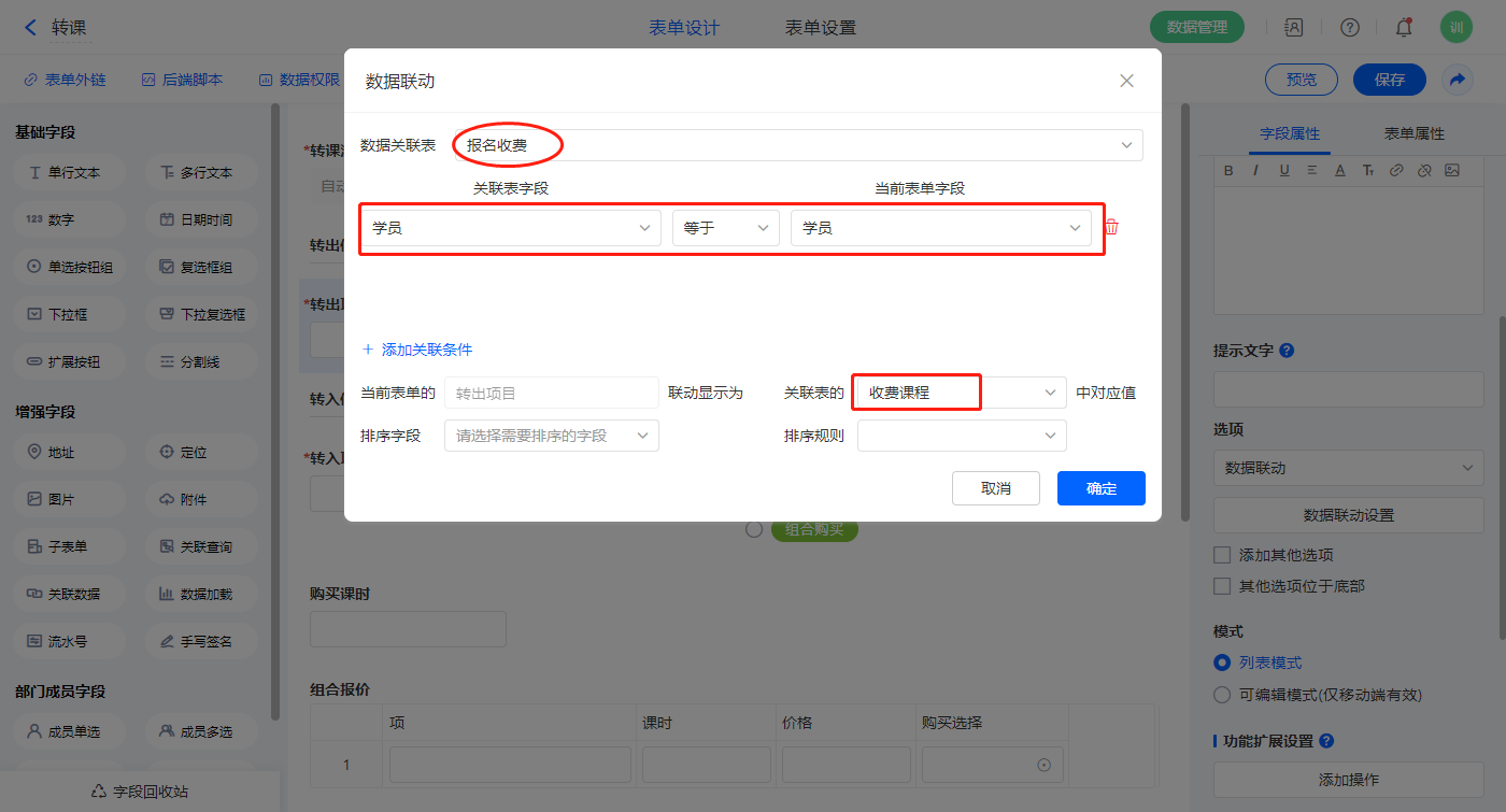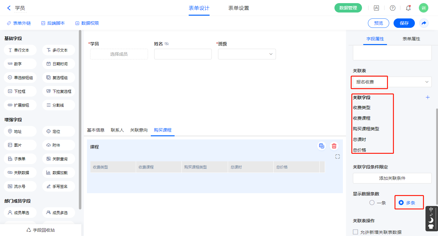 2)【课程】字段,设置关联表为【报名收费】并如图选择关联字段,设置显示数据条数为多条;