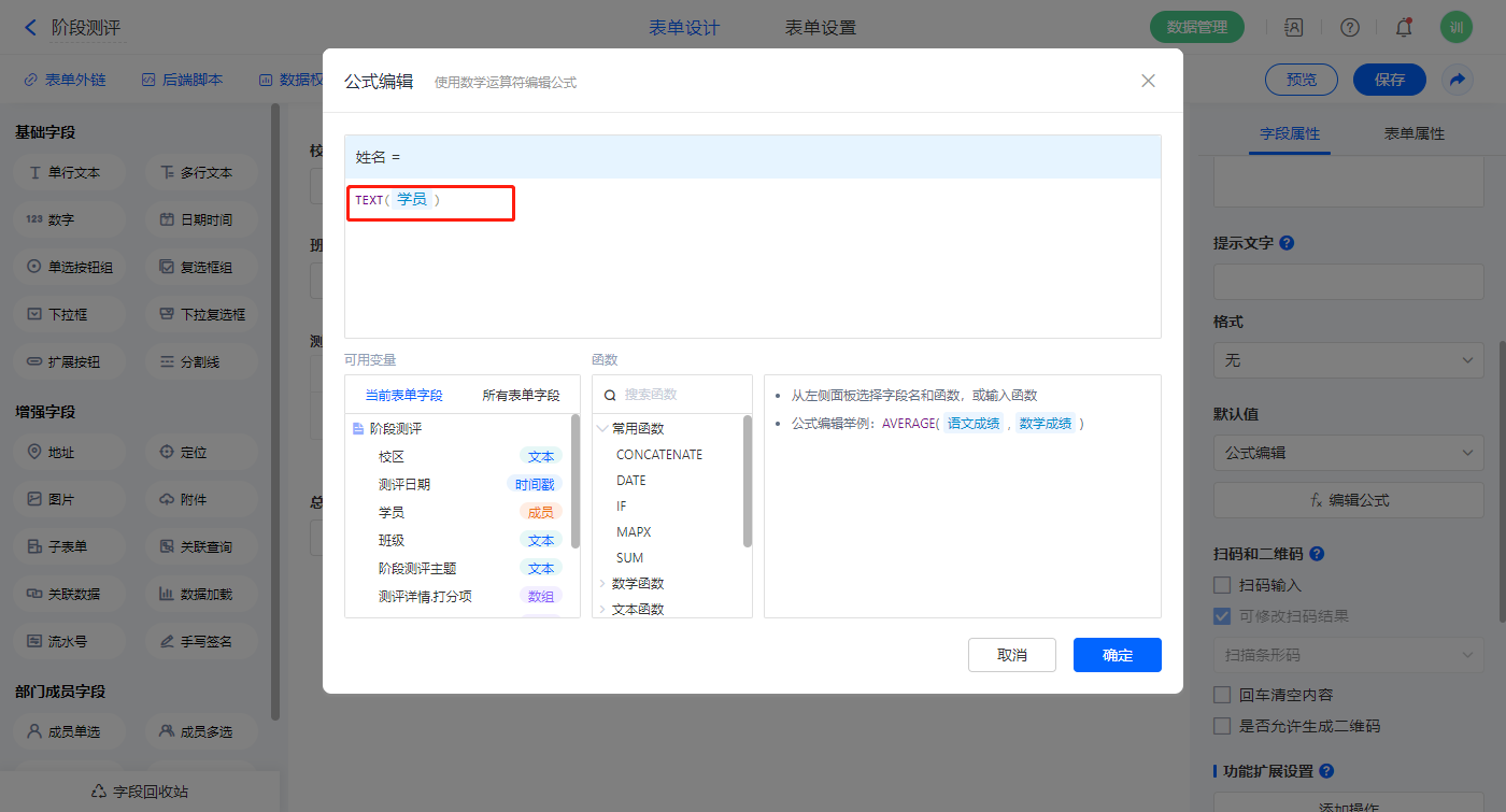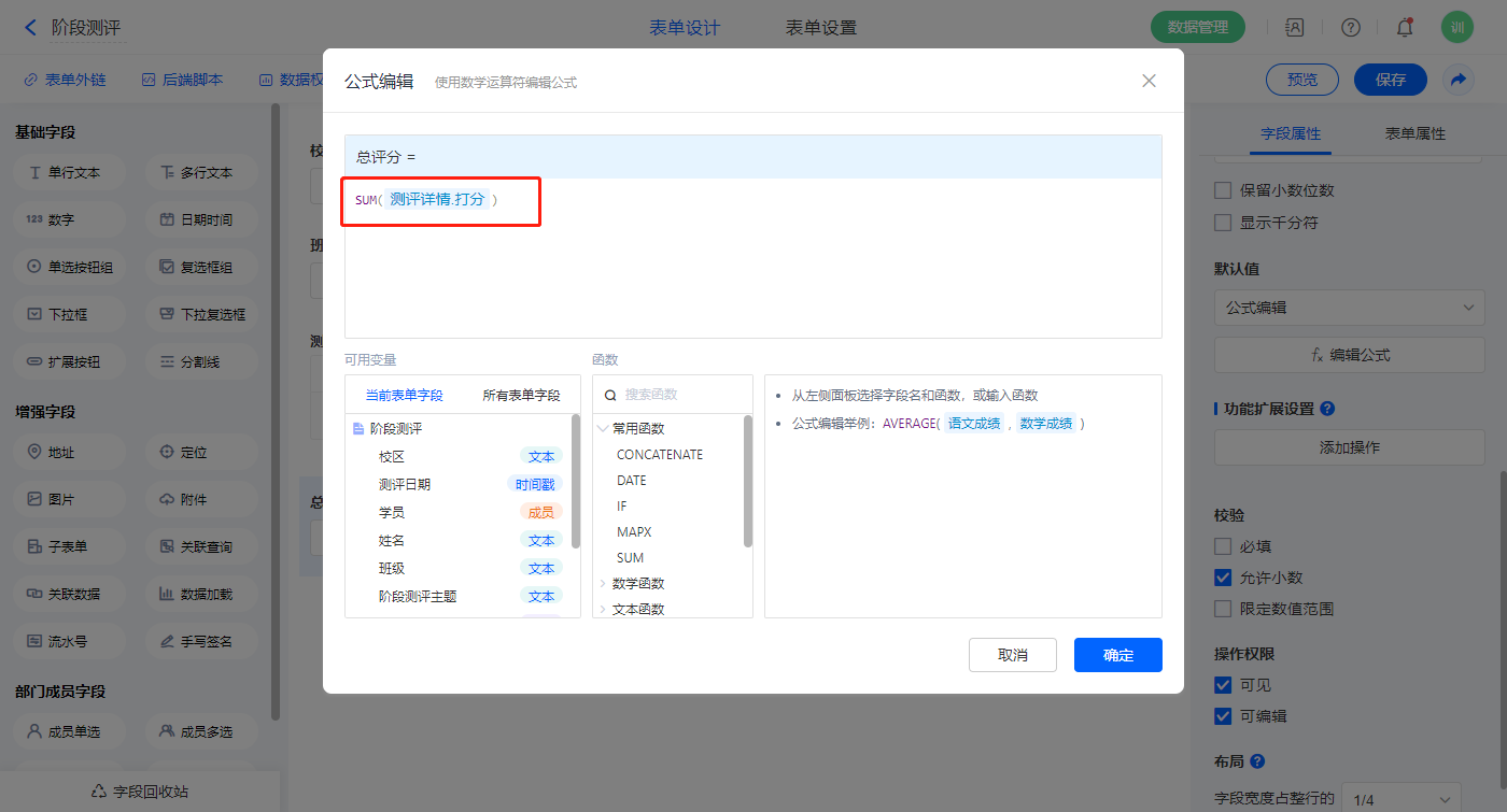 【总评分】字段,默认值选择公式编辑,如图设置公式;