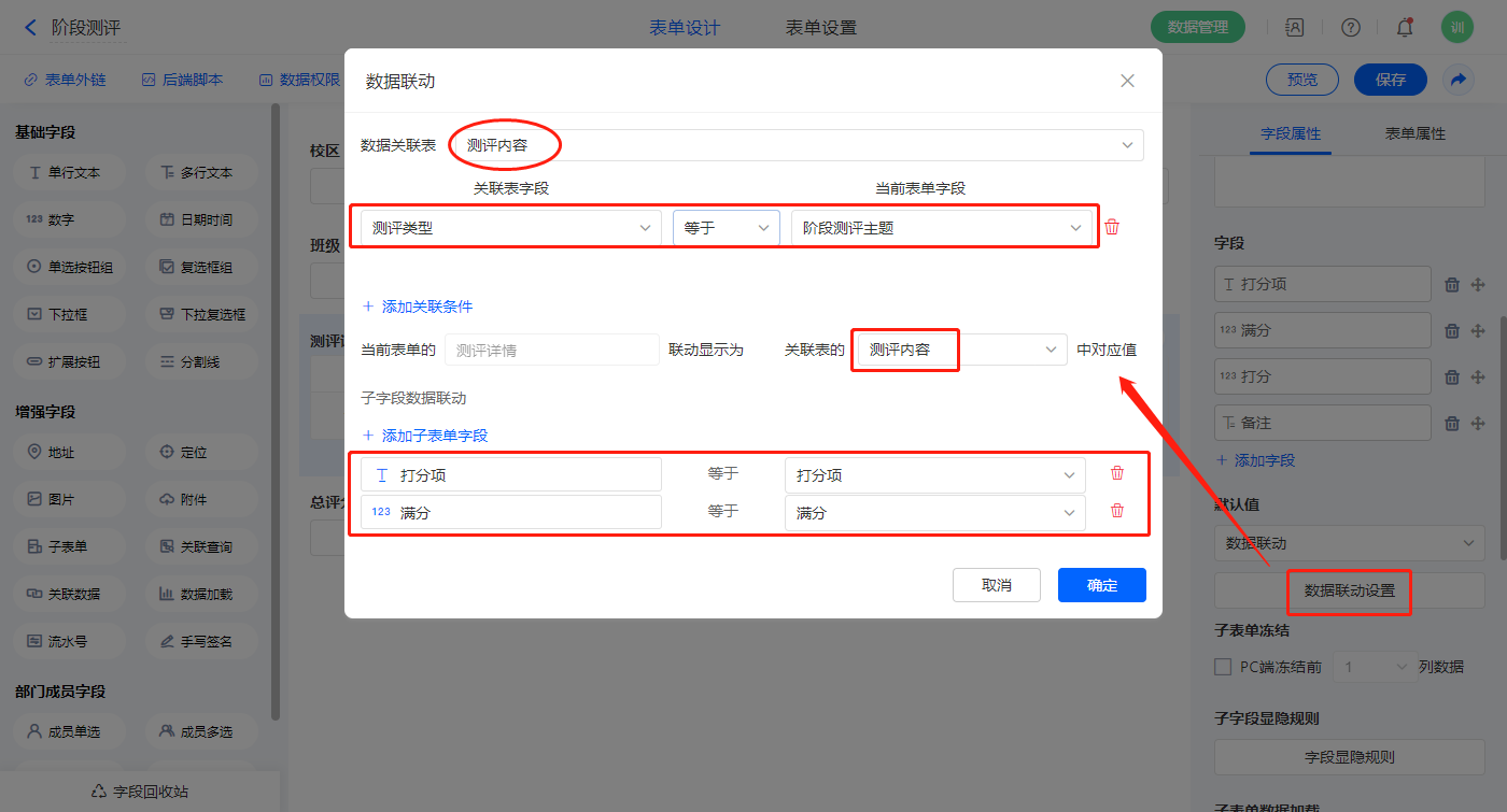 【测评详情】子表单字段,设置默认值为数据联动,设置联动条件及联动字段;