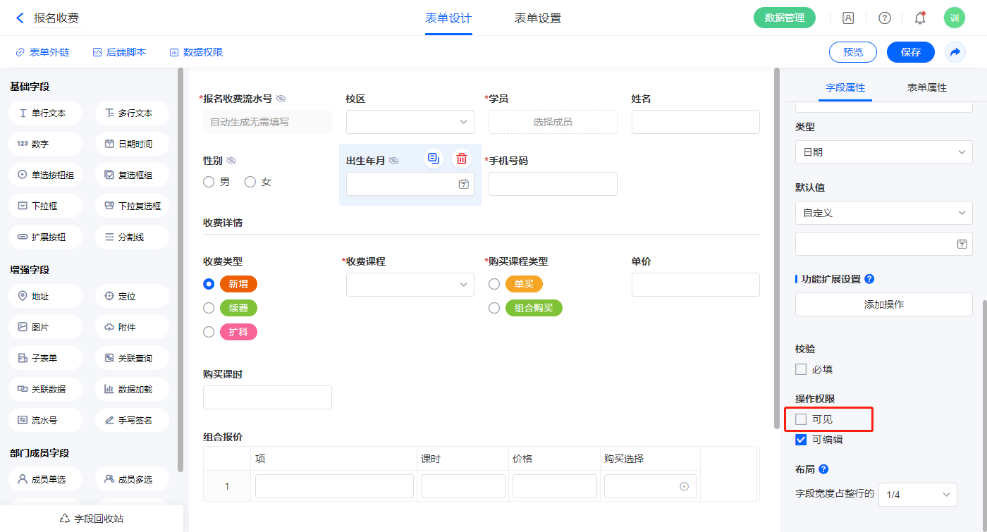 1)【报名收费流水号】、【出生年月】、【性别】、【购买总课时】、【关联收款单号】字段,设置操作权限为不可见;