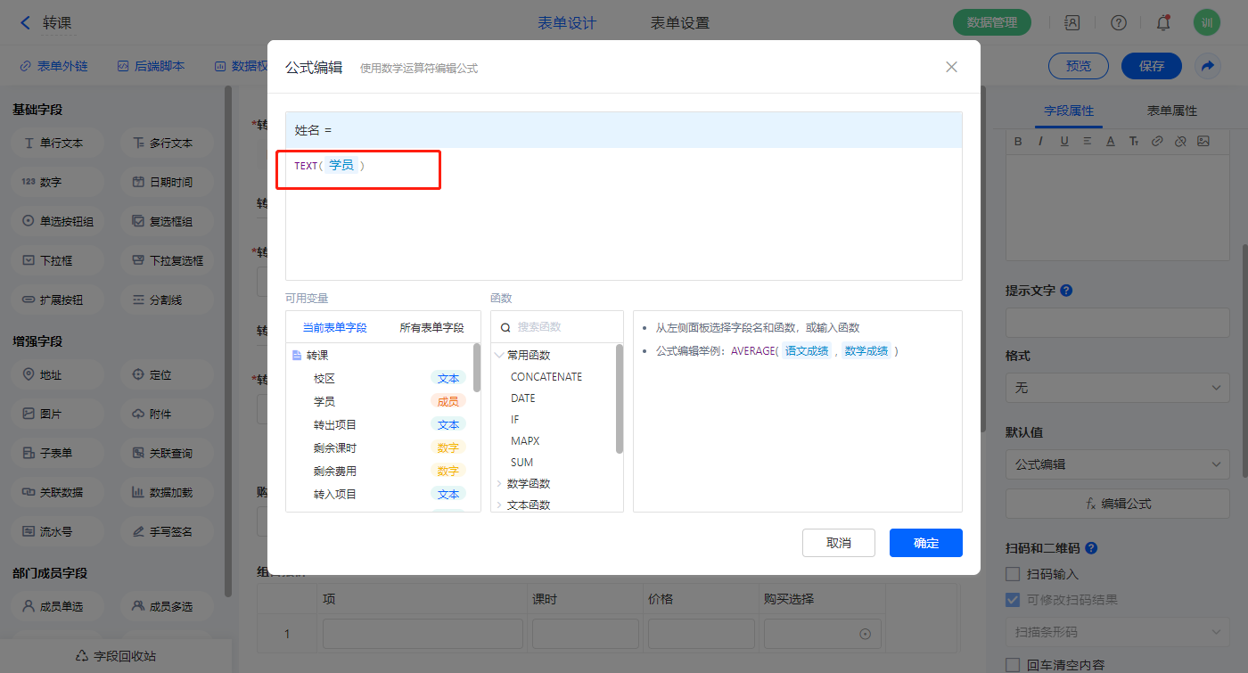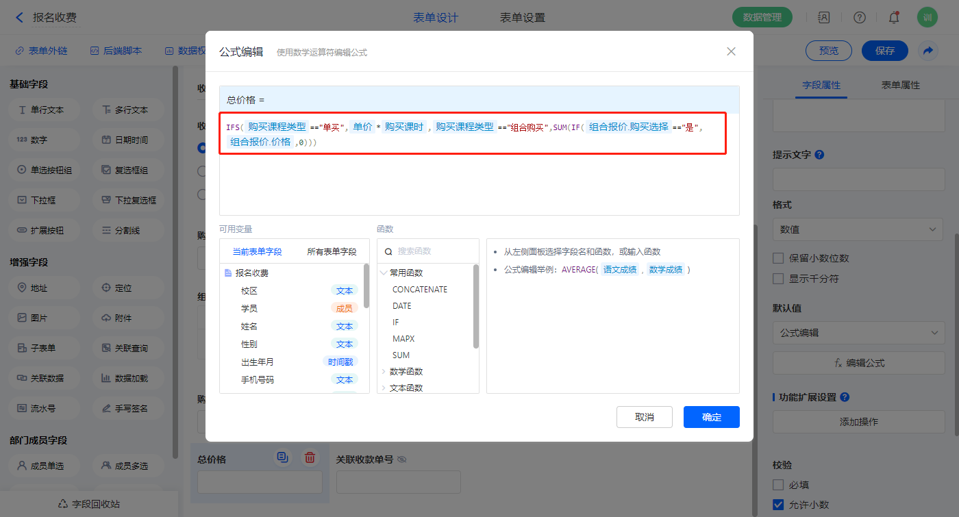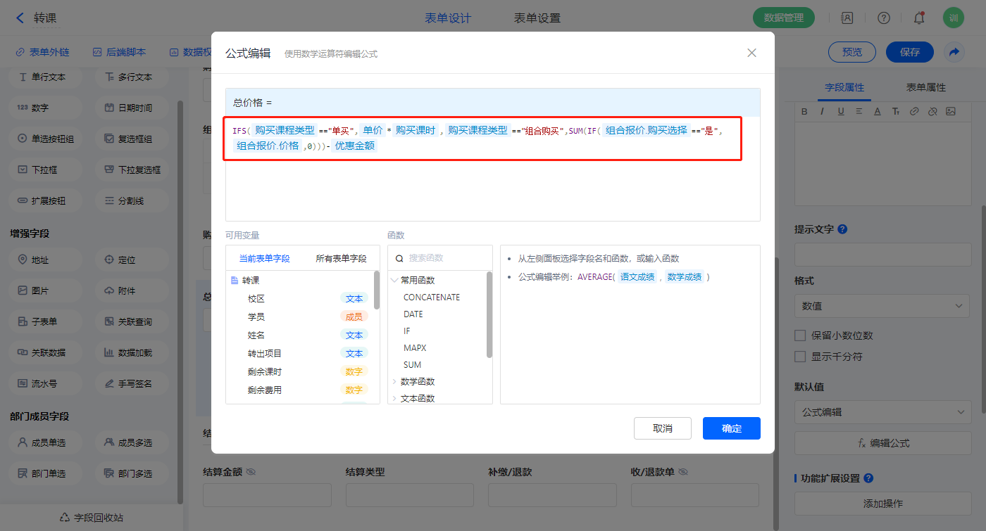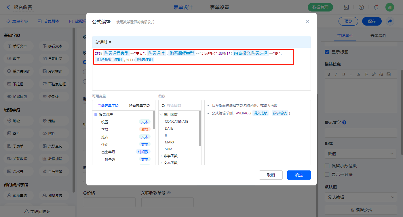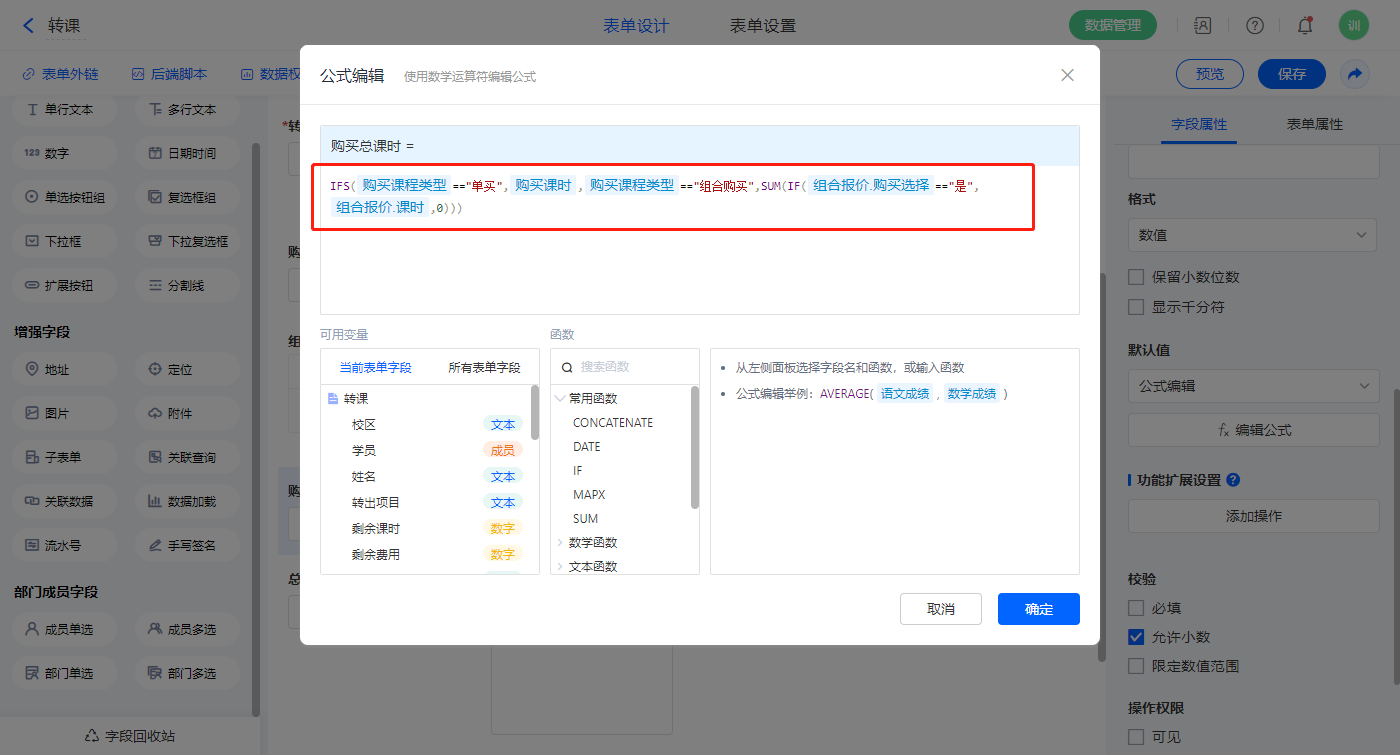 【购买总课时】字段,默认值选择公式编辑,如图设置公式;