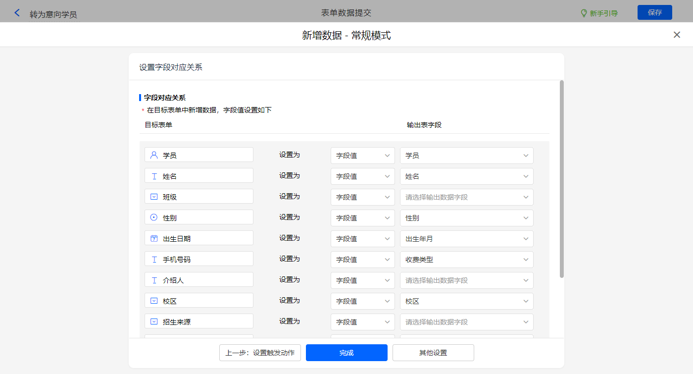 转为意向学员的数据助手,新增新增数据的执行动作,选择目标表单【学员】,选择对应赋值字段,设置好点击【完成】并保存该数据助手;