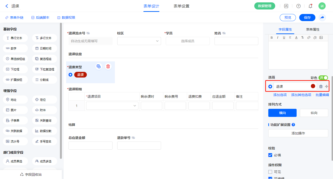 【退费类型】字段设置默认值为“退课”,并设置操作权限为不可见;