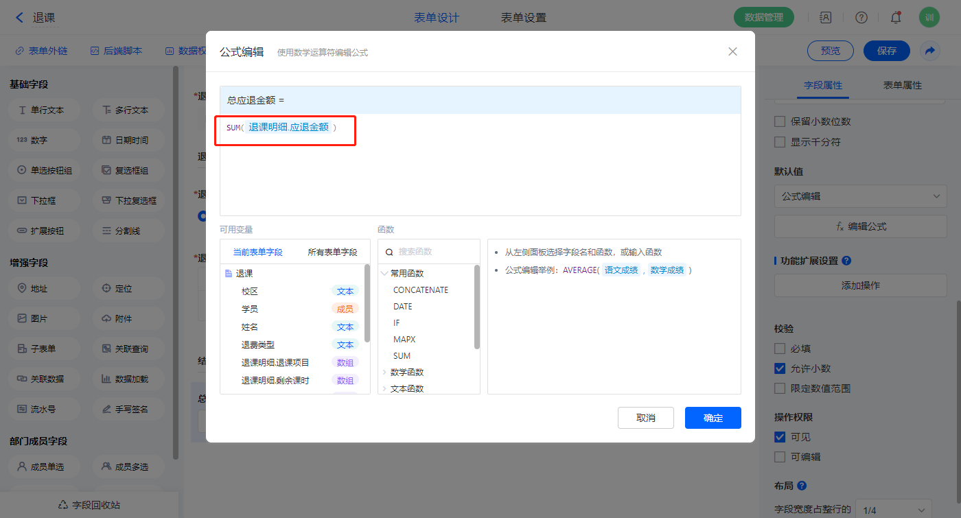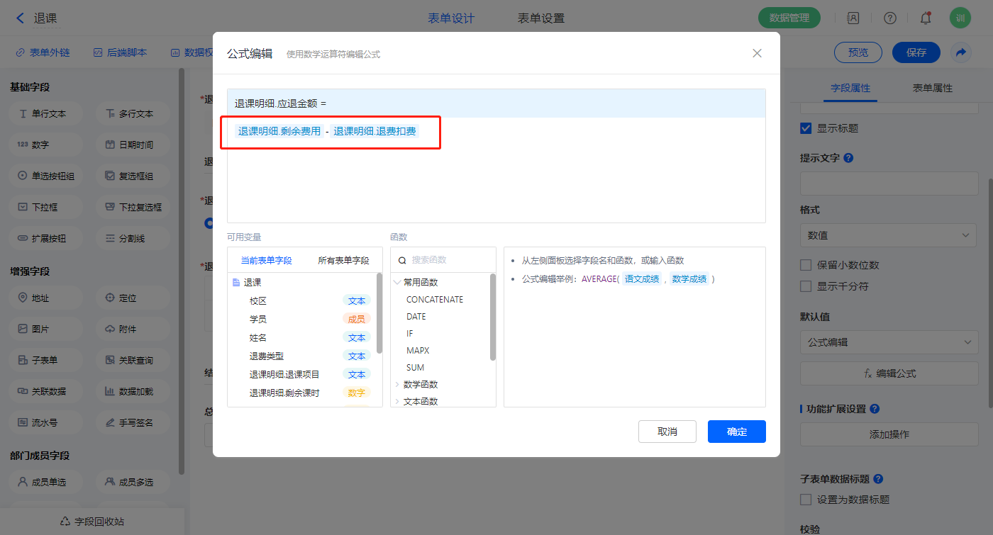 【退课明细.应退金额】字段,默认值选择公式编辑,如图设置公式;