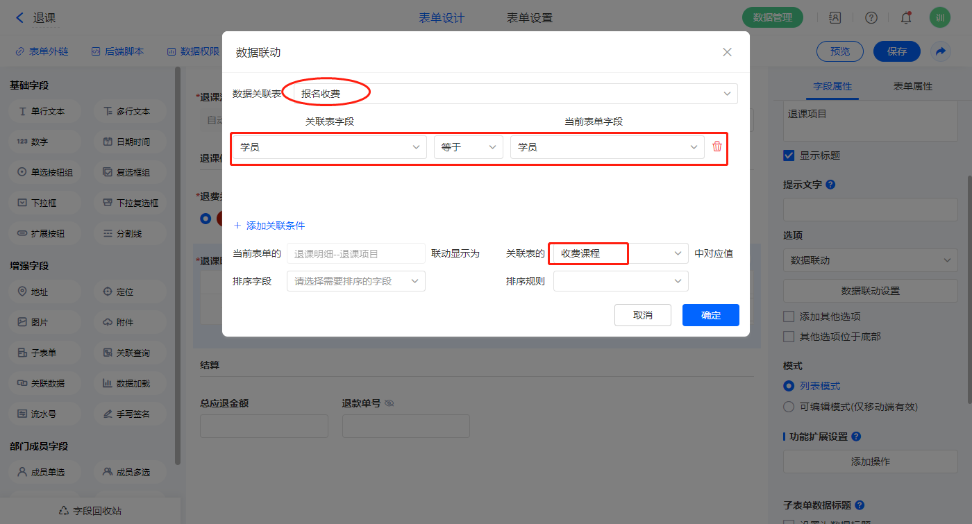 2)【退课明细.退课项目】字段,设置默认值为数据联动,设置联动条件及联动字段;