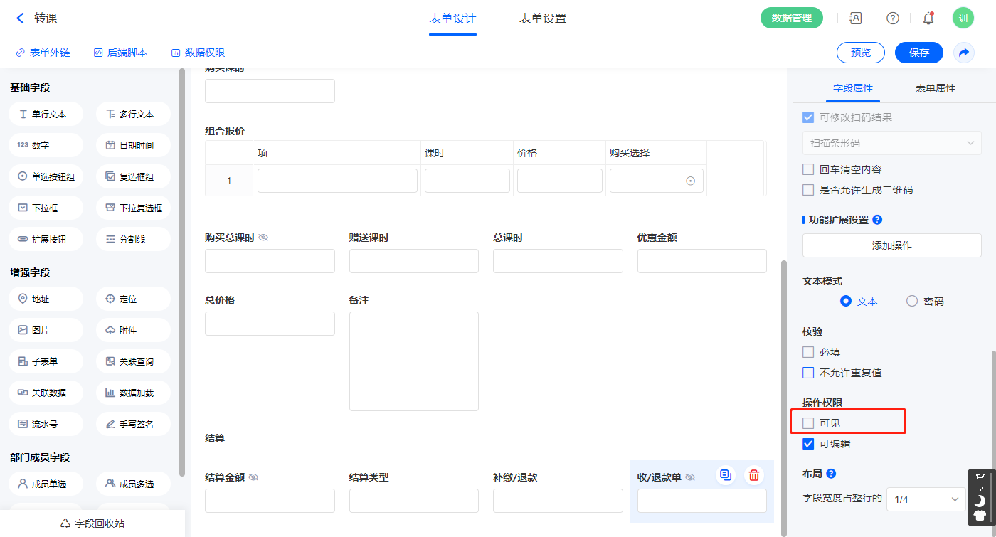 【转课流水号】、【购买总课时】、【结算金额】、【收/退款单】字段设置操作权限为不可见;