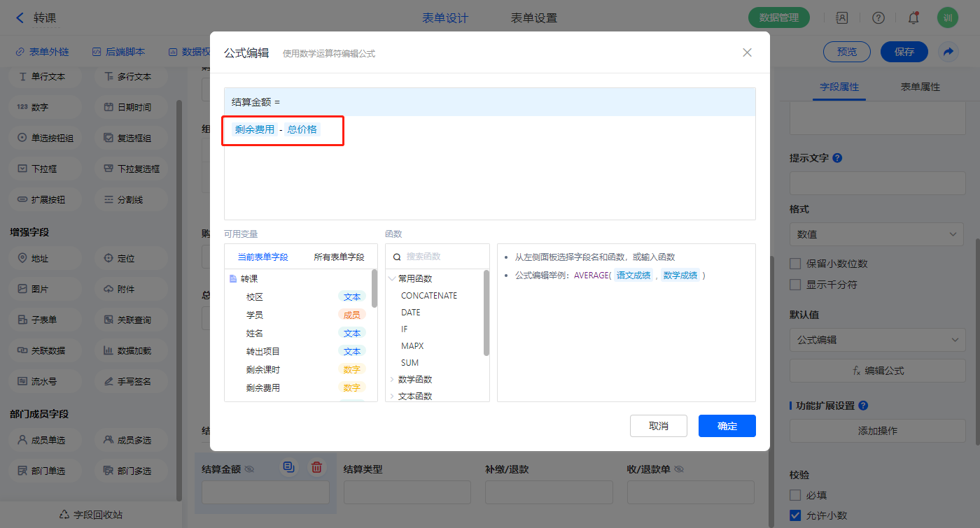 【结算金额】字段,默认值选择公式编辑,如图设置公式;