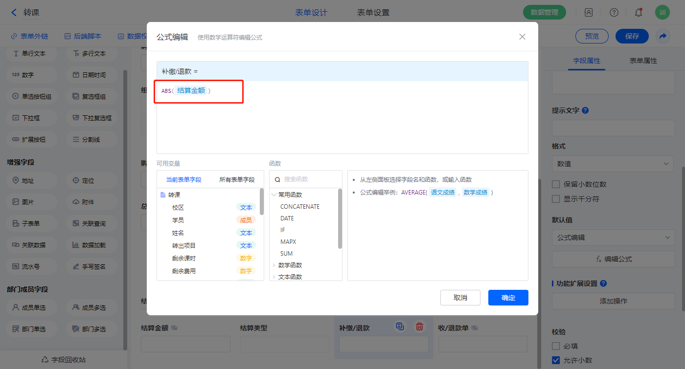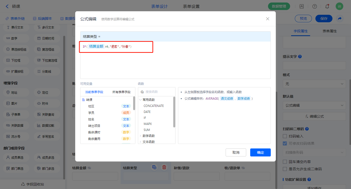 【补缴/退款】字段,默认值选择公式编辑,如图设置公式;