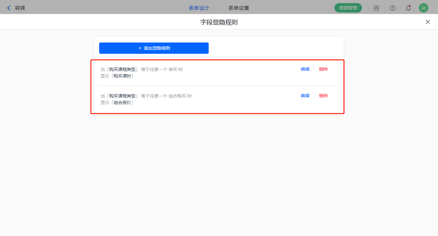 3)表单属性设置两条显隐规则,当【购买课程类型】字段等于单买,显示【购买课时】字段;当【购买课程类型】字段等于组合,显示【组合报价】字段;