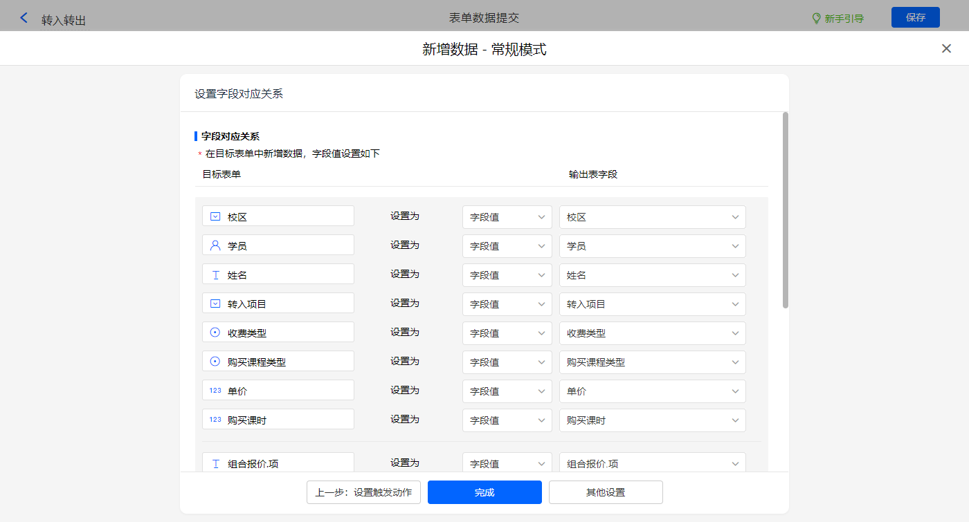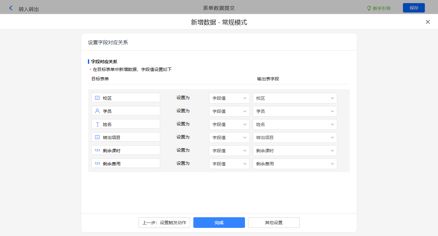 新增新增数据的执行动作,选择目标表单【转课(出)】,选择对应赋值字段,设置好点击【完成】并保存该数据助手;