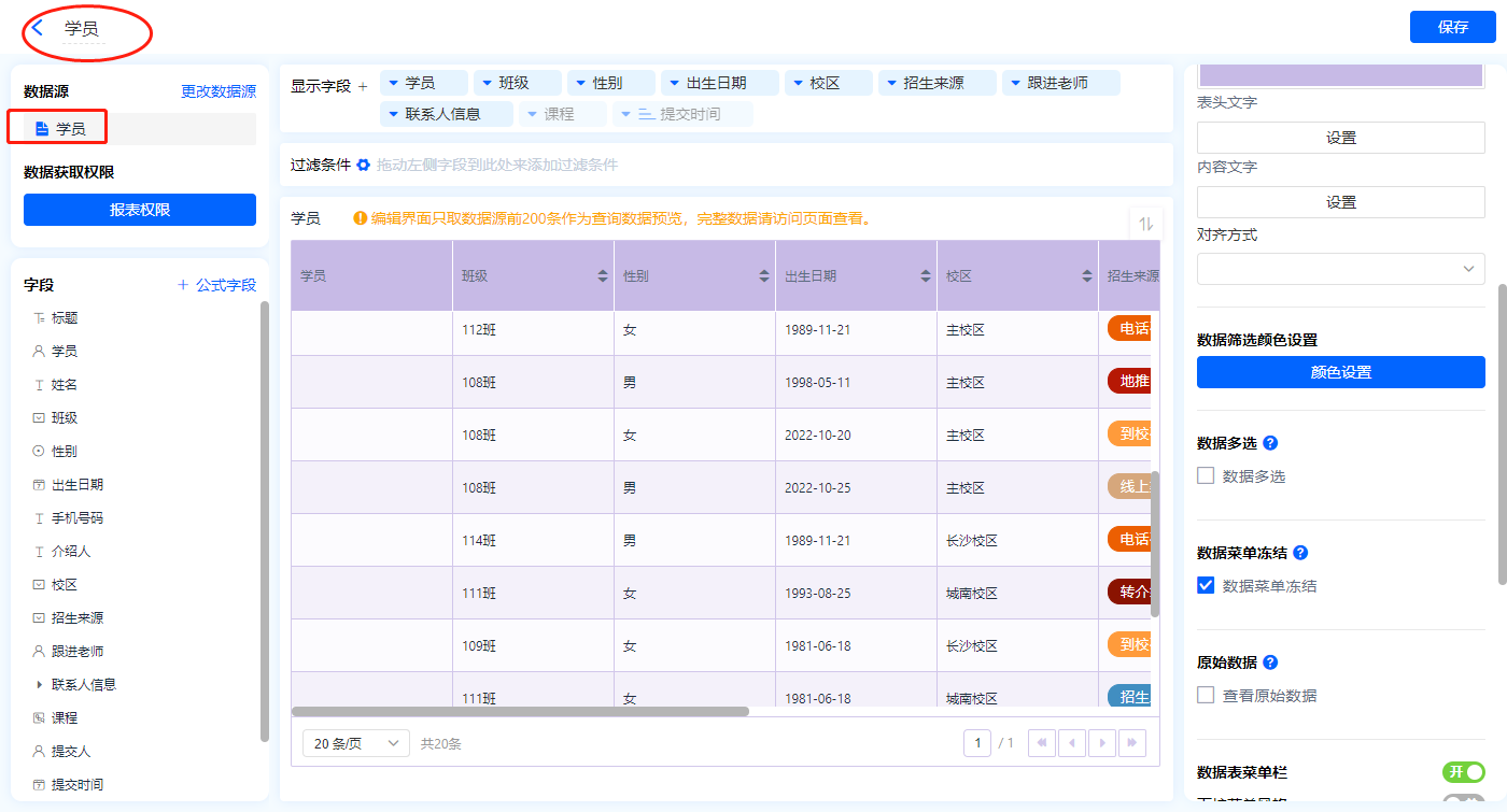 1)新增【学员信息】报表,用基础报表【数据表】展示数据源为表单【学员】的数据;