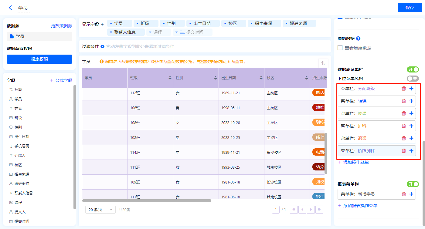 2)新增数据表菜单栏,【分配班级】、【转课】、【续课】、【扩科】、【退课】、【阶段测评】;