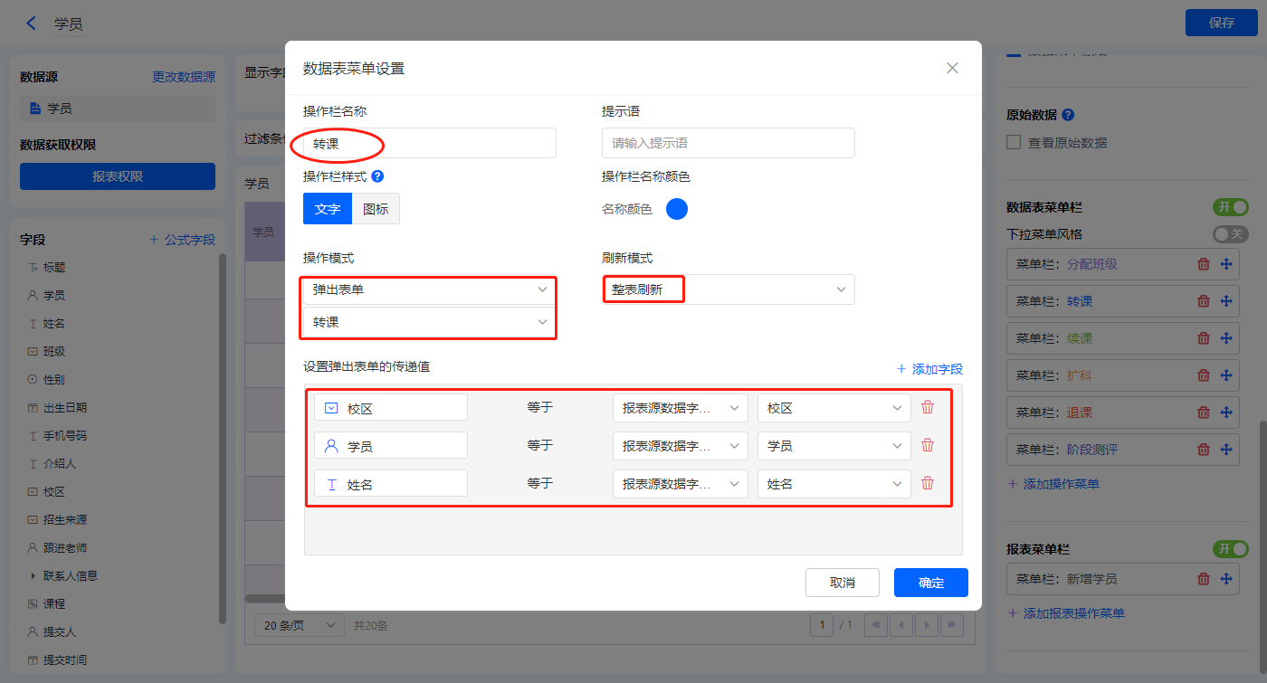 【转课】的菜单栏,操作模式设置为弹出表单【转课】;