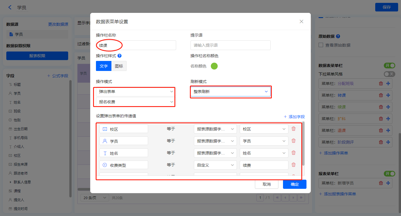 【续课】的菜单栏,操作模式设置为弹出表单【报名收费】;