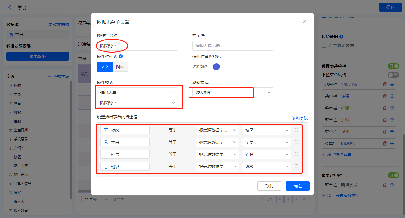 【阶段测评】的菜单栏,操作模式设置为弹出表单【阶段测评】;