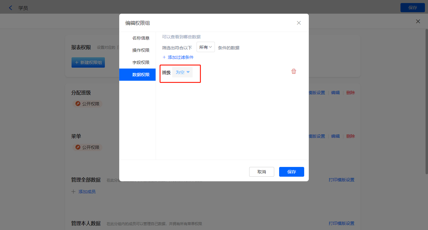 数据权限添加过滤条件,【班级】为空;
