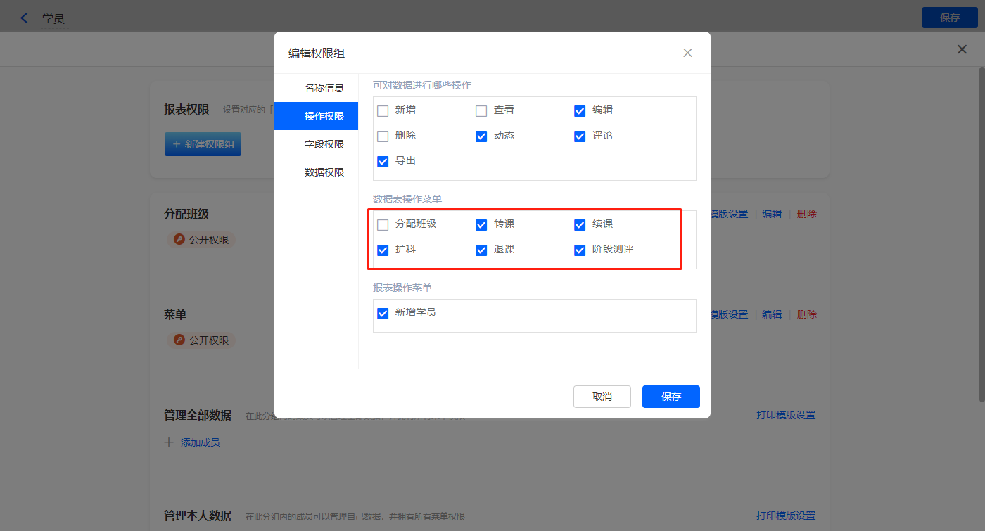 4)设置报表的权限,填入权限组名称分配班级,选择可操作的数据表菜单;