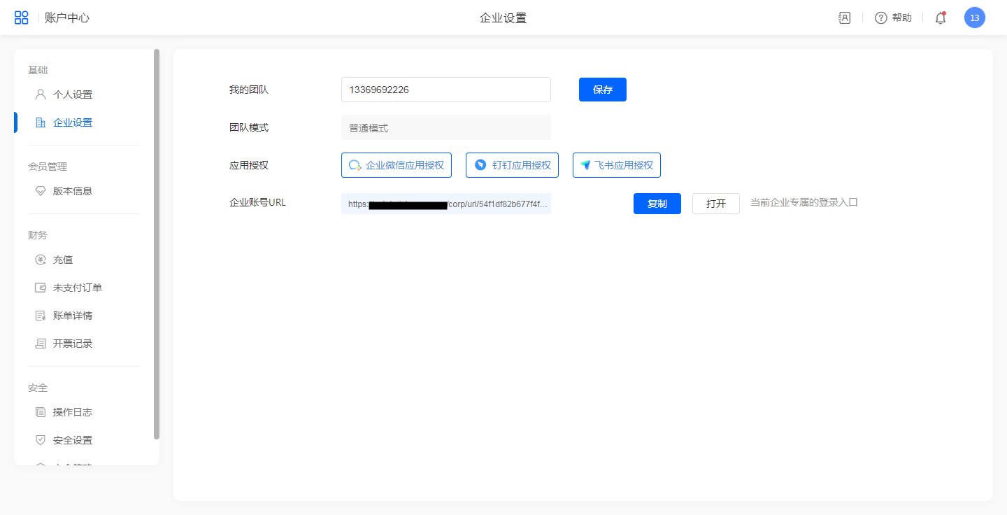 展示团队的基本信息,可以绑定钉钉或企业微信。