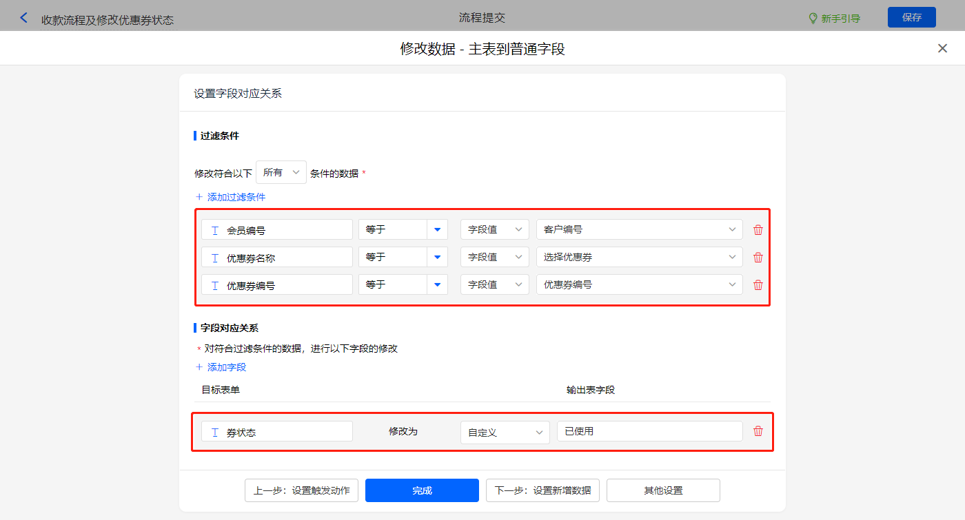 其他设置触发条件为【金额退回方式】等于优惠券,设置好点击【完成】并保存该数据助手;