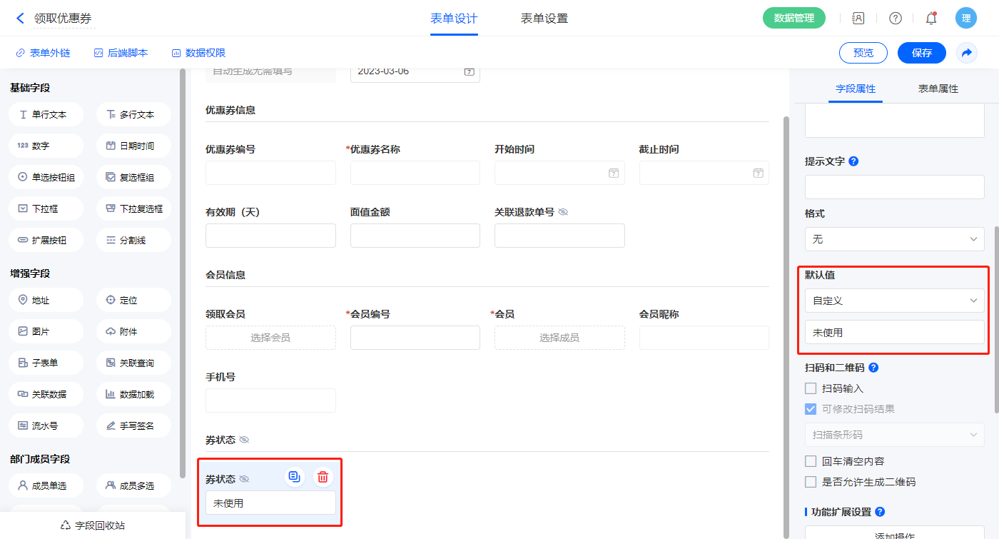 | 优惠券名称 | 单行文本 | 会员 | 成员单选 |