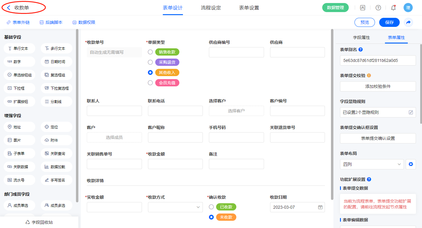 1)【销售单号】字段,选择设置为关联其他表单数据,关联销售单的【销售单号】字段;