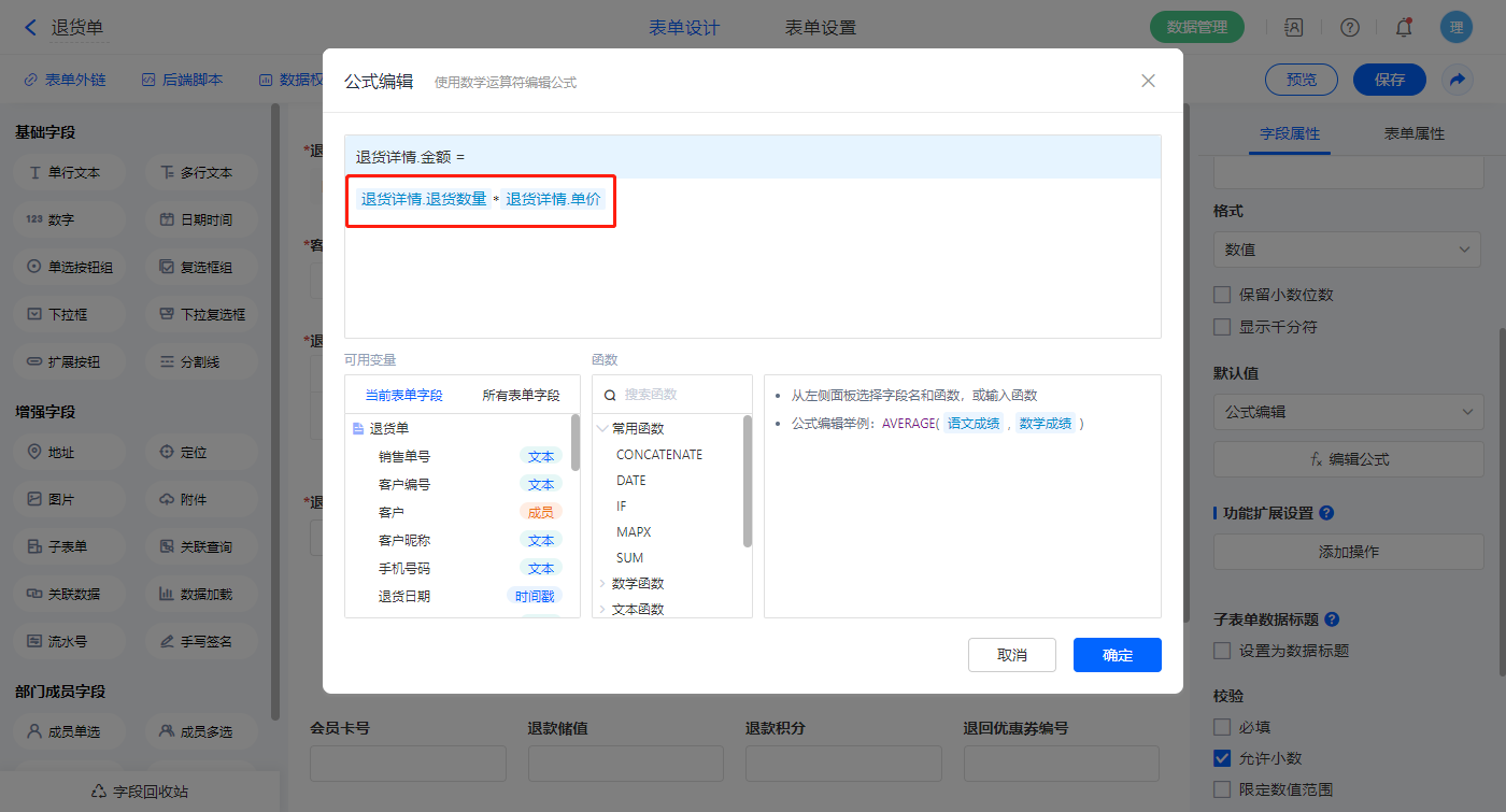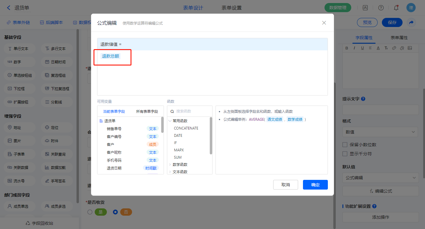 【退款金额】字段,设置默认值为公式编辑,如图设置公式;