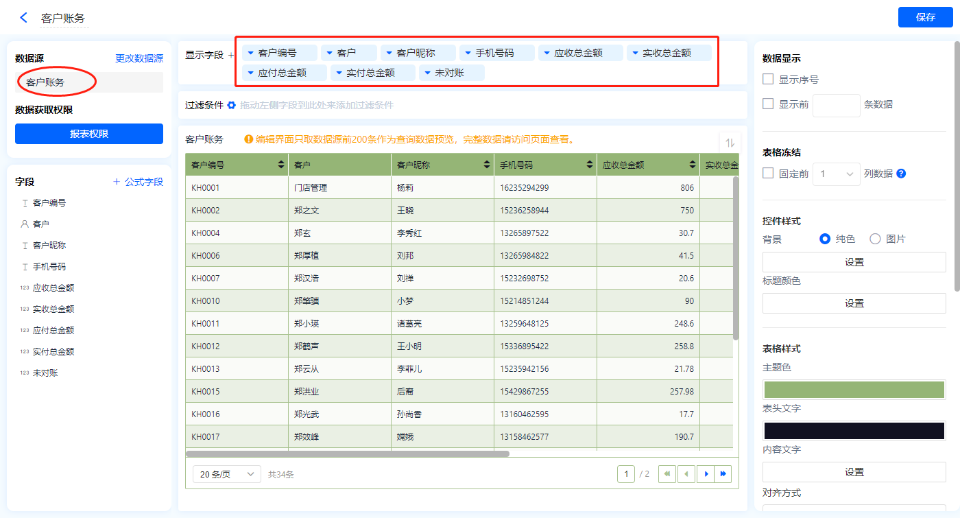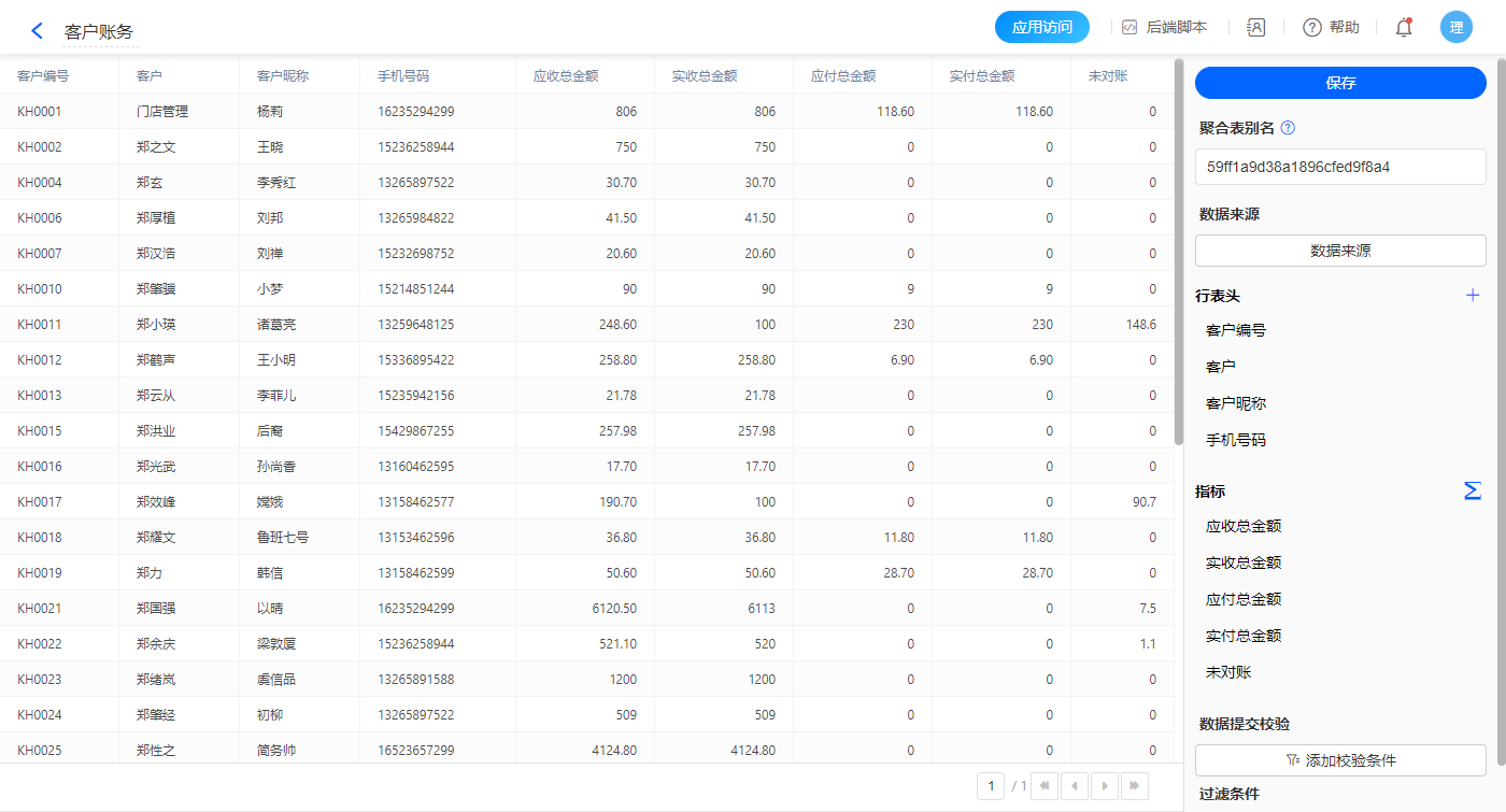 1)新增【客户账务】报表,用基础报表【数据表】展示数据源为聚合表【客户账务】的数据;