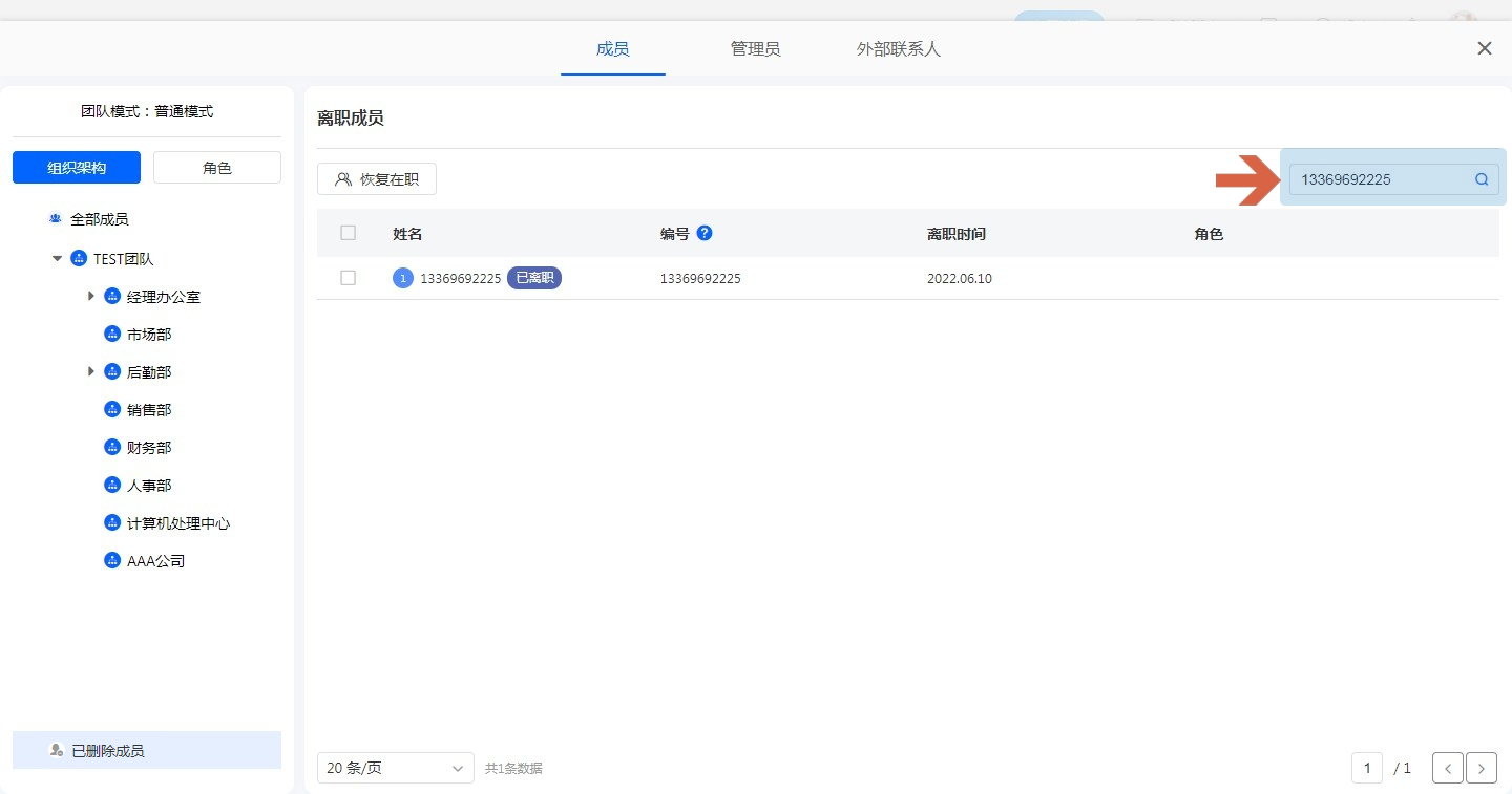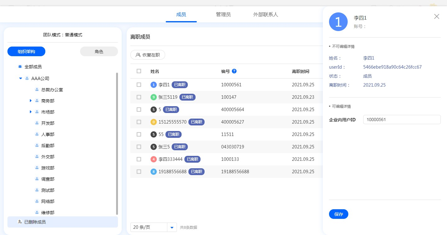 恢复在职可以将选中已删除成员恢复到在职状态,部门恢复到顶级部门下。