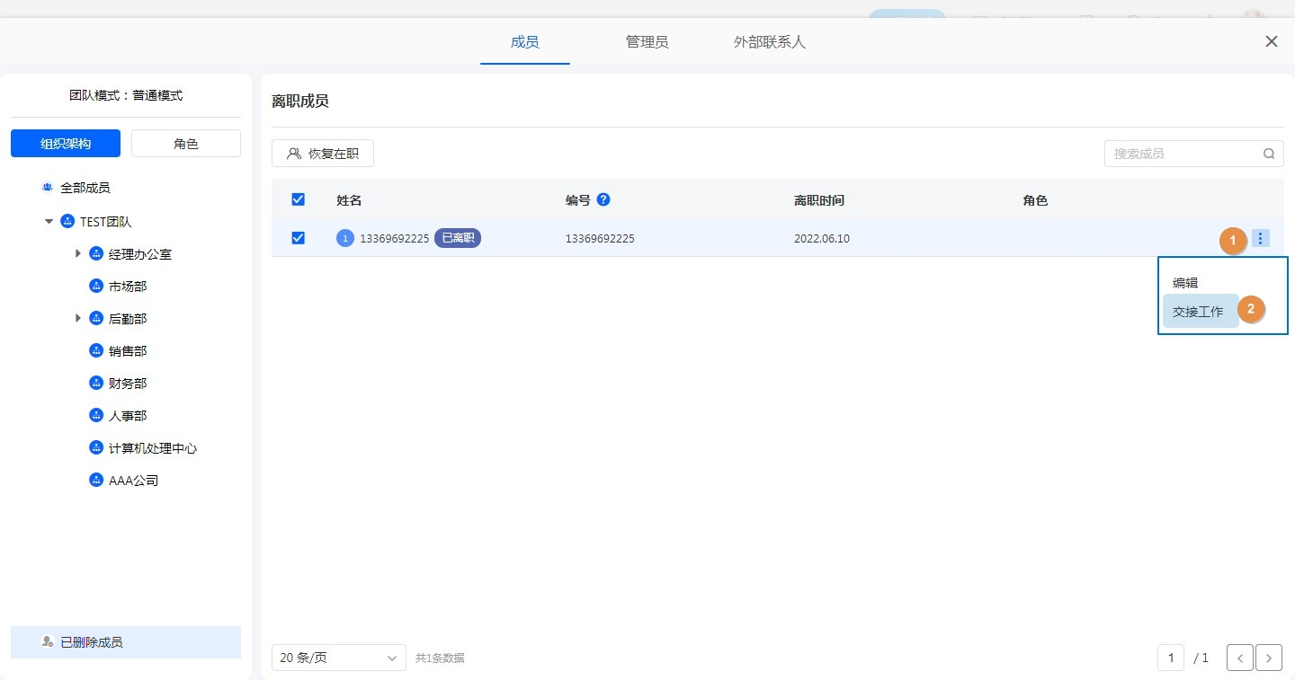 已删除成员中可以管理已删除的成员,可以进行恢复在职、编辑信息、交接工作、搜索等操作