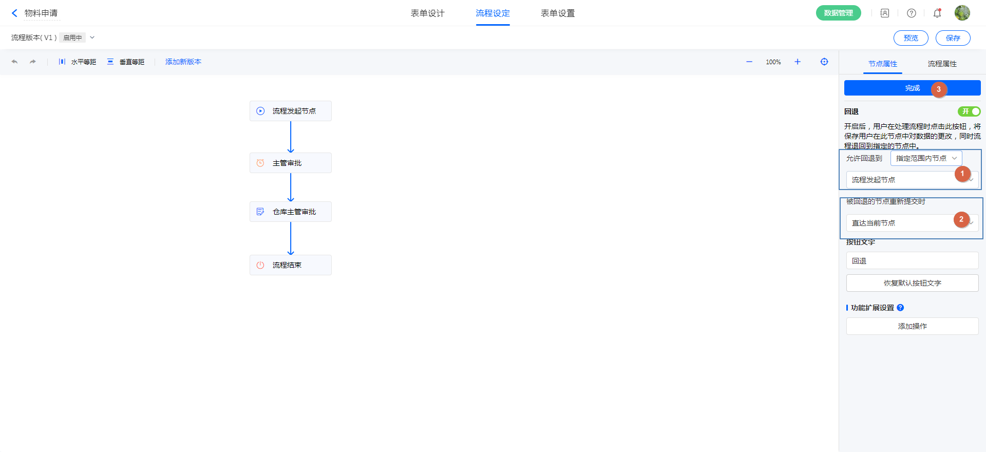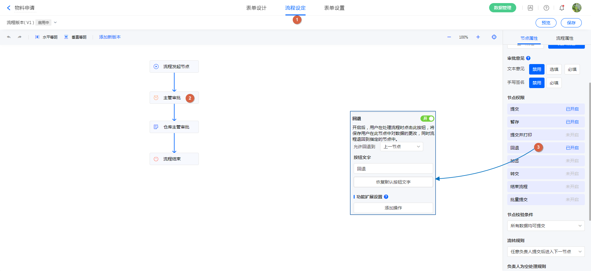 1)进入「流程设定」,选中需要设置回退的流程节点,在「节点属性 >> 更多属性 >> 节点操作」点击「回退」: