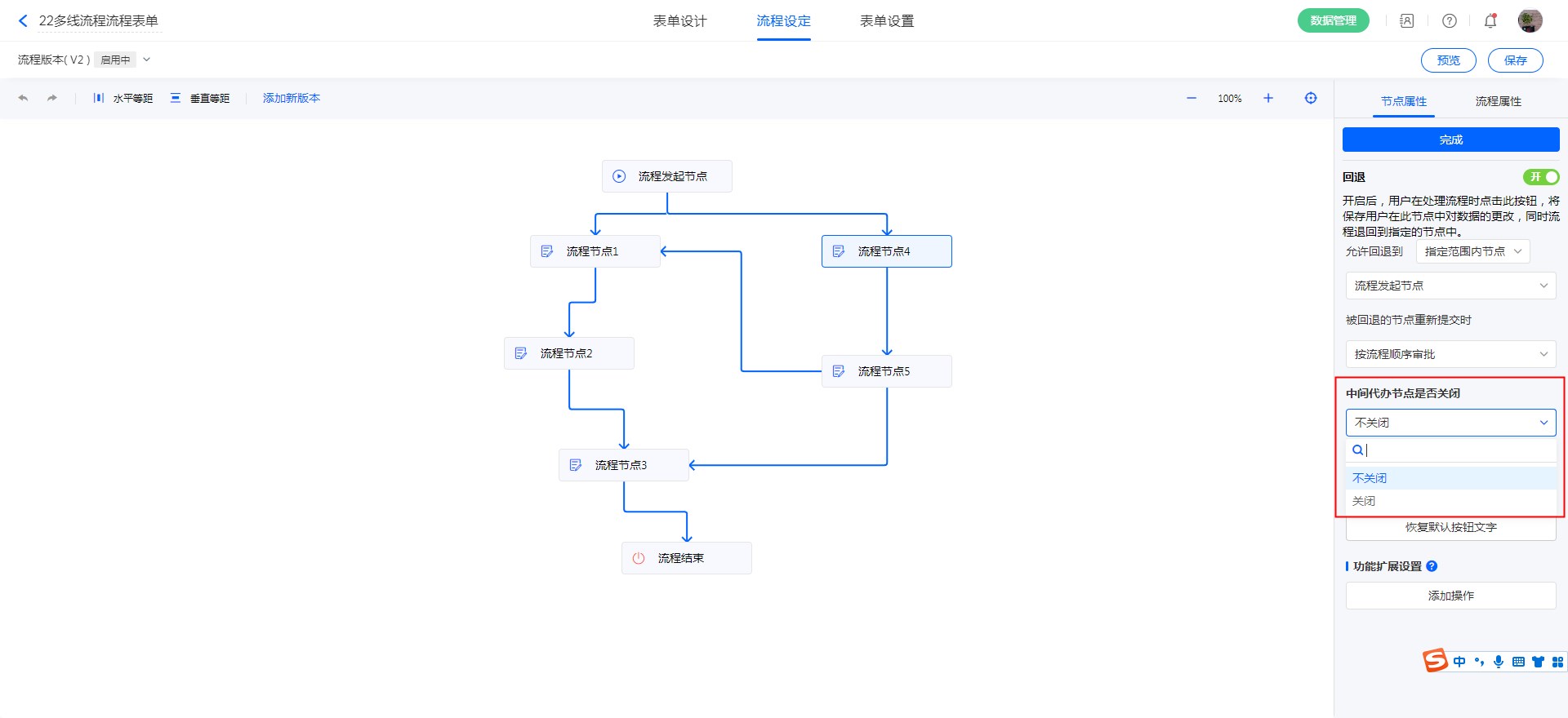 • 中间代办节点是否关闭