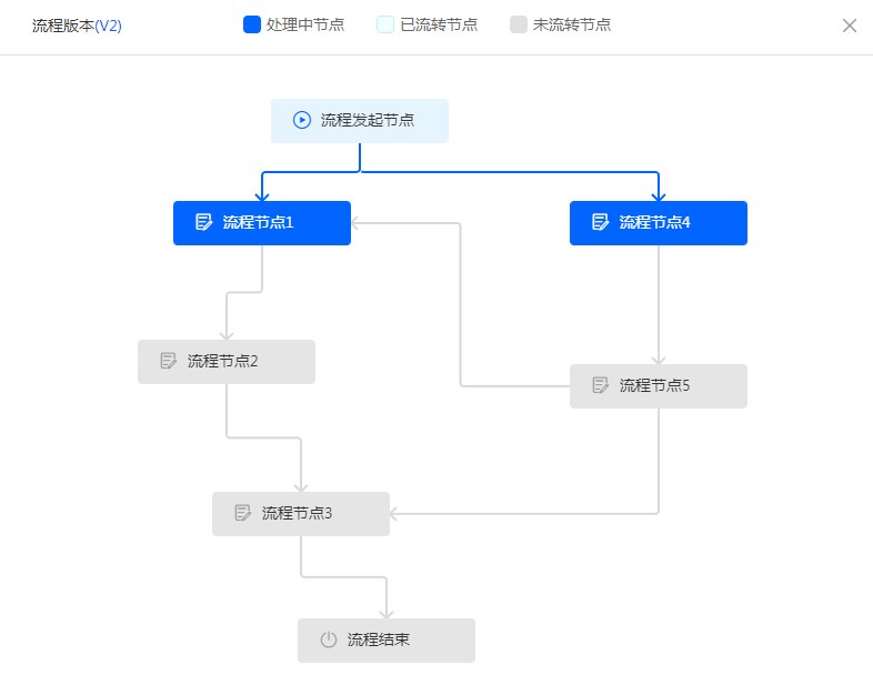 示例:流程发起节点发起流程,流转到流程节点1和流程节点4。