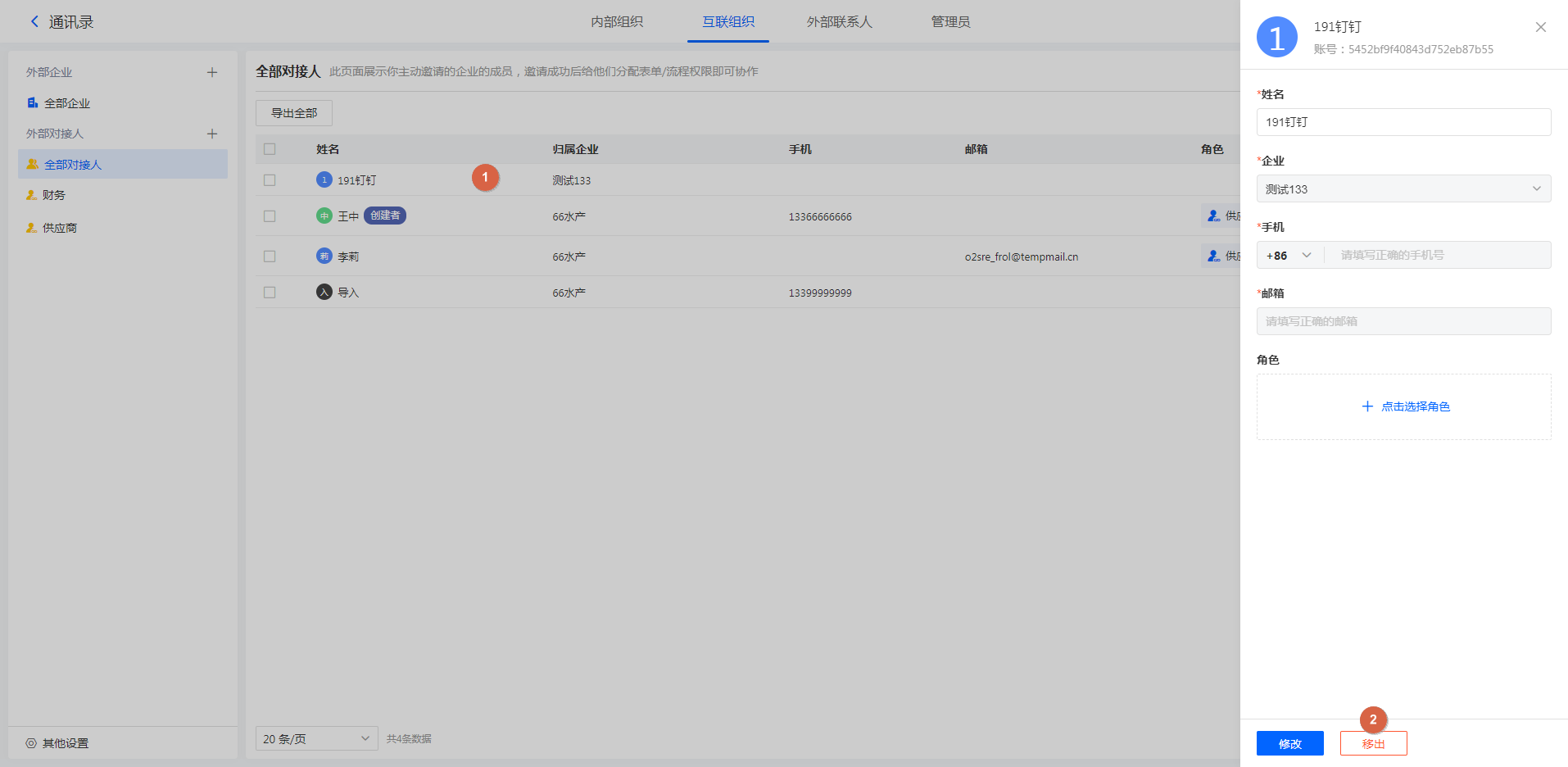注:移出后,对接人无法再参与此角色相关的外部企业协作,但不会删除移出的对接人,可在全部对接人处继续设置角色。