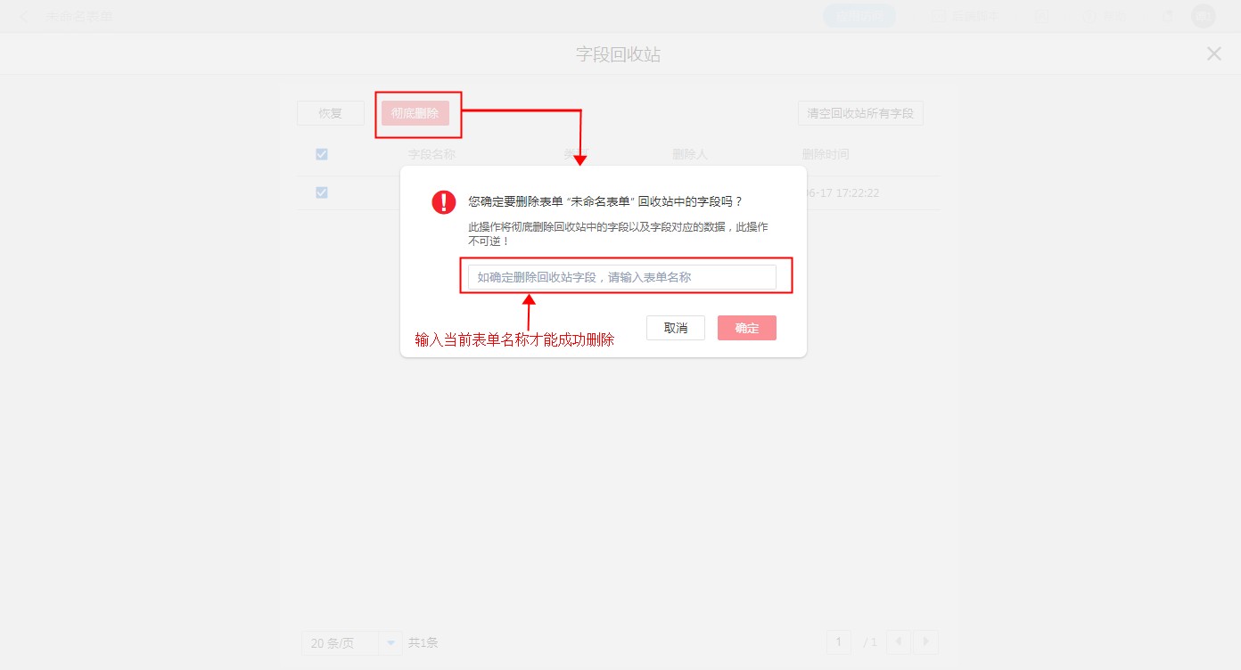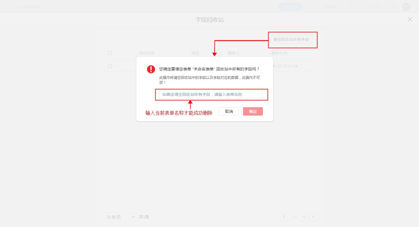 点击【清空回收站所有字段】,会弹出确认弹窗,需要输入表单名称才能成功删除。