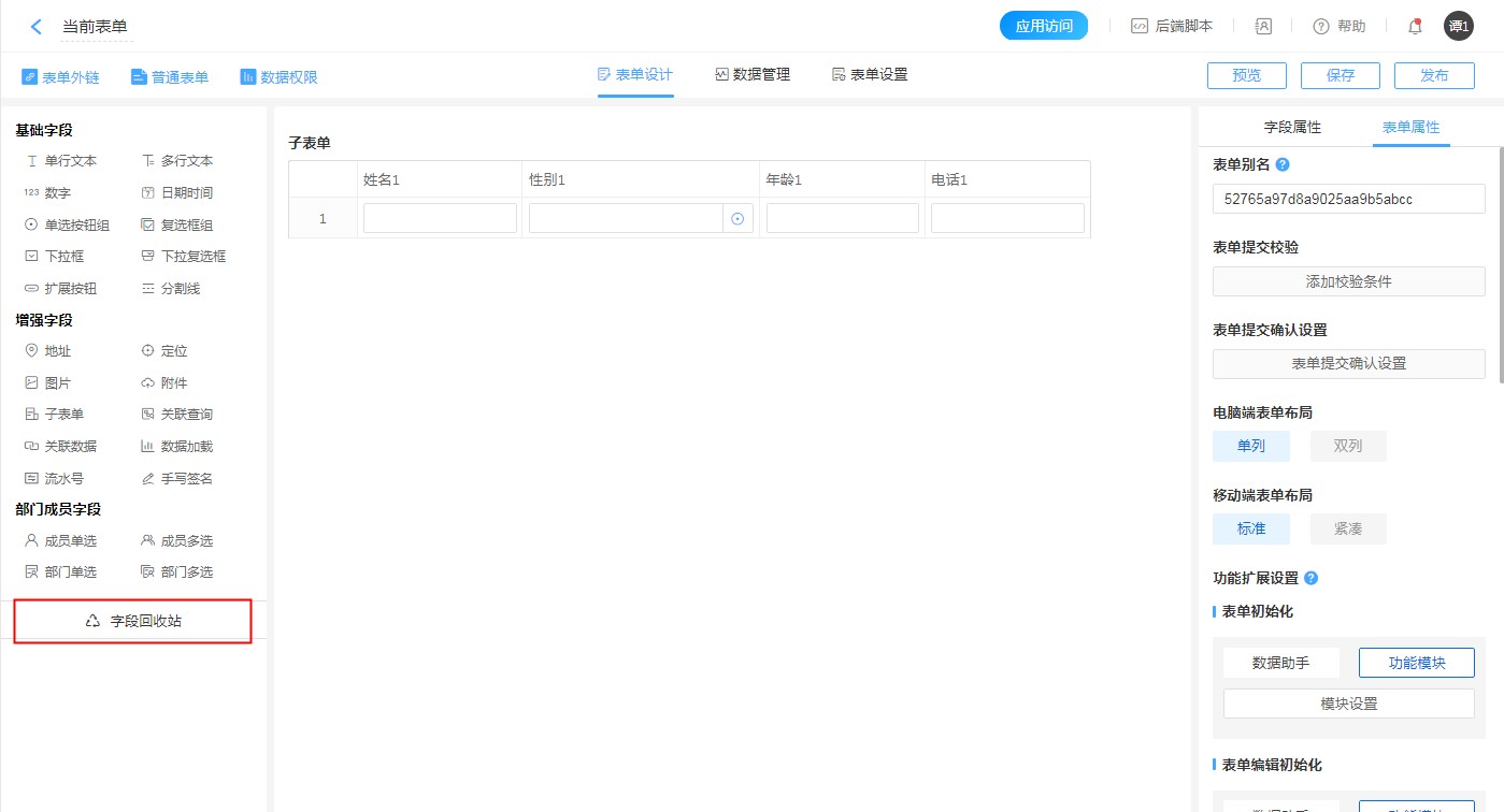表单设计 >> 基础设置 >> 表单设计 >> 控件回收站 ;